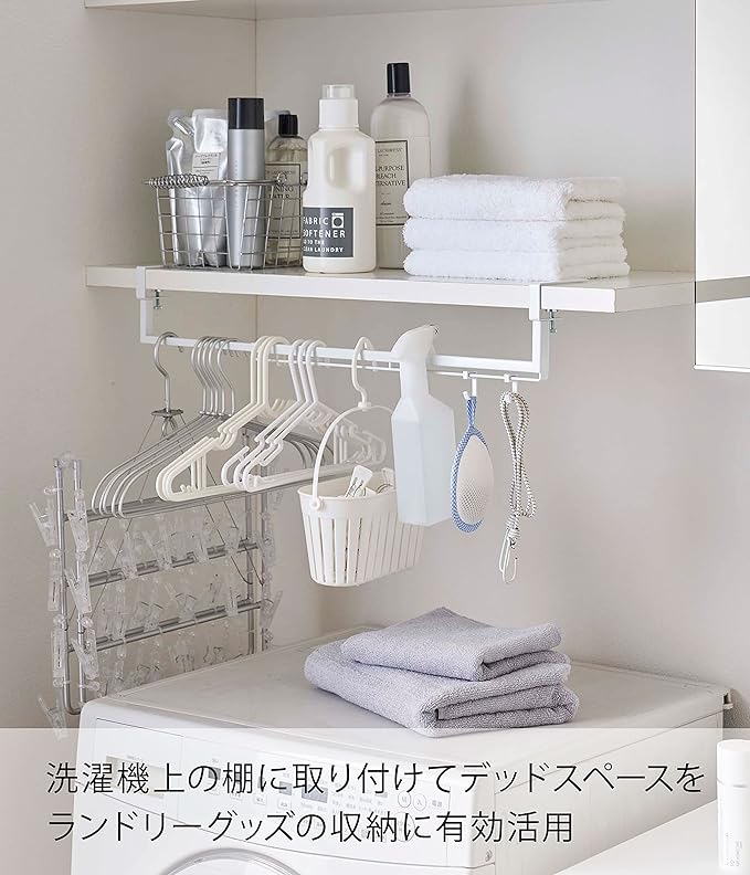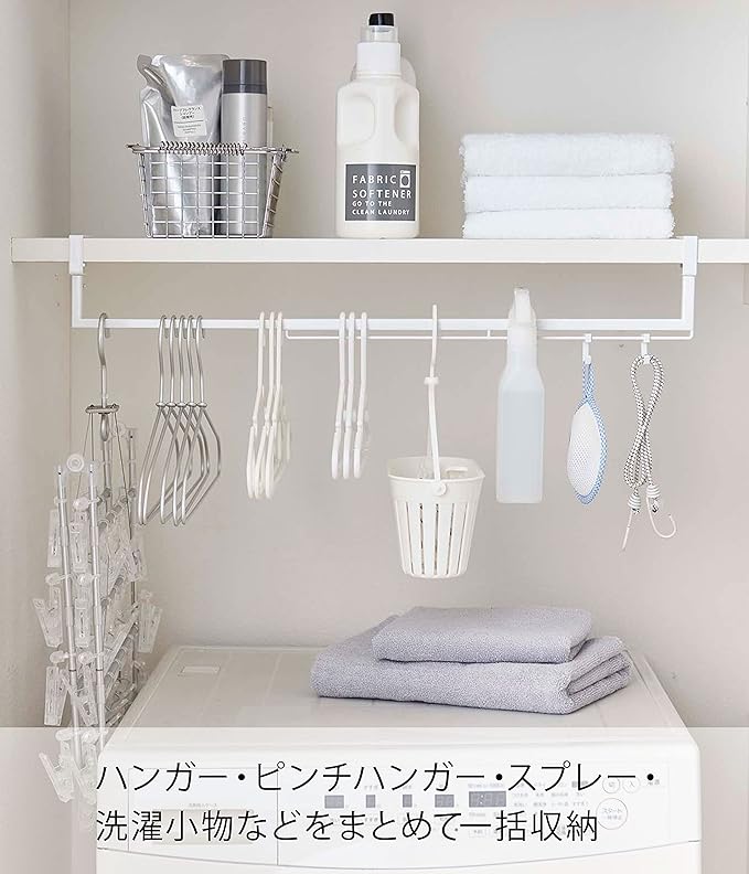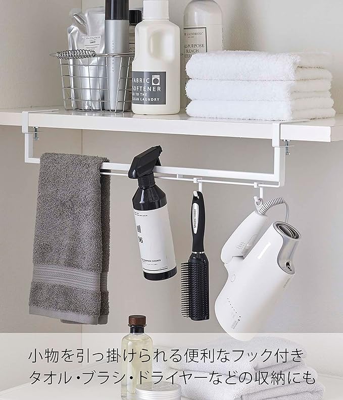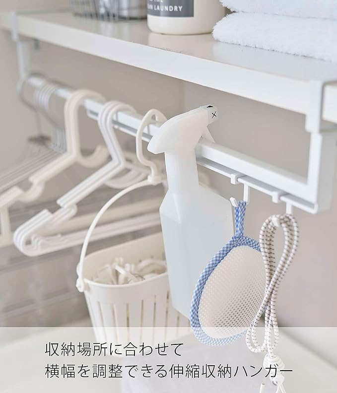 棚下に収納スペースを増設。伸縮収納ハンガー 洗濯機上の棚に取り付けられる棚下収納ハンガーです。洗濯機と棚の間のデッドスペースを有効活用。 棚のサイズに合わせて横幅を調整できる伸縮タイプです。ハンガー・ピンチハンガー・スプレータイプの洗濯のりなど、ランドリー小物をまとめて引っ掛け収納できちゃいます。ランドリールームに合わせやすい、2色のカラーバリエーション カラーは、明るい印象のホワイトと、スタイリッシュなブラックをご用意しました。どんなランドリールームにもマッチしやすいモノトーンカラーです。壁面や床、ランドリー小物に合わせて、お好きなカラーをお選びください。戸棚タイプも引き出しタイプもOK。 サイズは横幅46.5~80cm×奥行き10cm×高さ11cmの伸縮タイプで、収納するランドリー小物の量やスペース、棚の大きさによって横幅を調整可能です。対応可能な棚板は、棚板の厚さが1.3~3cm以内、幅46.5cm以上、奥行き10cm以上のものです。調整ネジで棚板にしっかり固定できます。ランドリー小物からヘアケア用品まで ハンガーやピンチハンガーを引っ掛けてランドリー小物収納に。付属のフックを活用してドライヤーやブラシ、ヘアスプレー、フェイスタイルを掛けてお風呂上りや朝の身支度用品の収納スペースにするのもおすすめです。毎日の暮らしをよりスマートに どんな空間ともなじみの良いスタイリッシュさと、使い勝手の良さを追求したのが山崎実業の『tower』シリーズ。無駄を省き洗練されたデザインは機能性にも優れていて、毎日の生活をより快適に豊かにしてくれます。