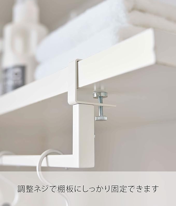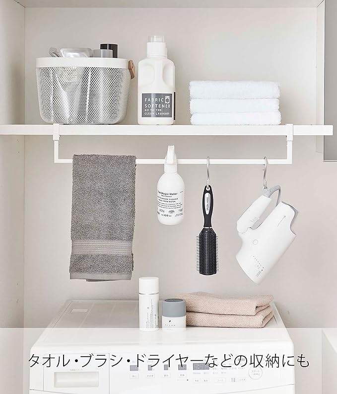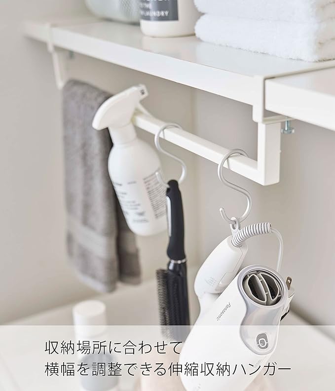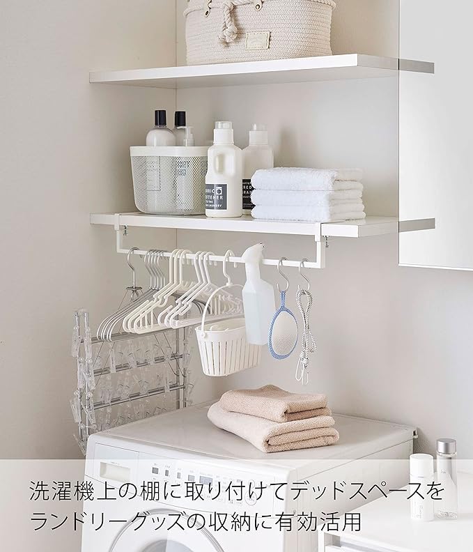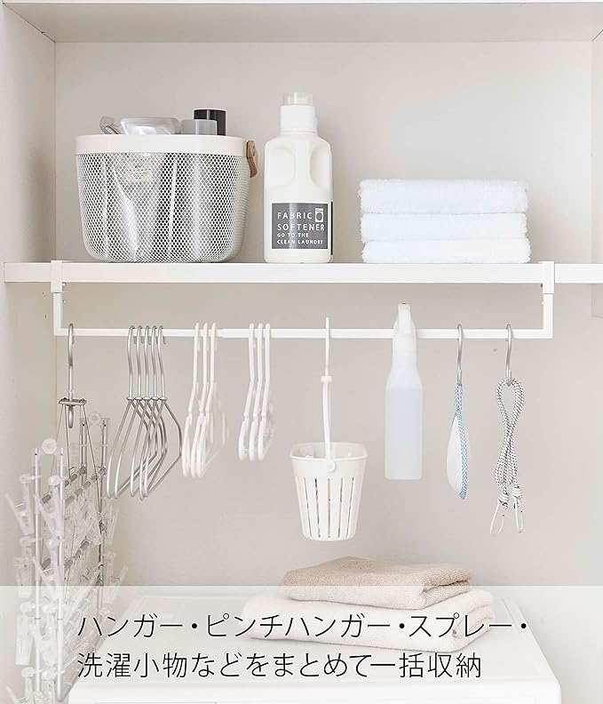 洗濯機上の棚に取り付けてスペースを有効活用。収納場所に合わせて横幅を調整できる伸縮収納ハンガー。ハンガー・ピンチハンガー・スプレー・洗濯小物などを引っかけて、まとめて一括収納。タオル・ブラシ・ドライヤーなどの洗面用品の収納にも便利。ハンガー類は引っかけるだけの簡単収納。調整ネジで棚板にしっかり固定できます。