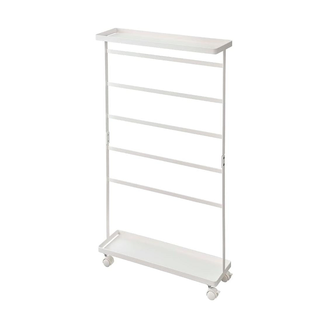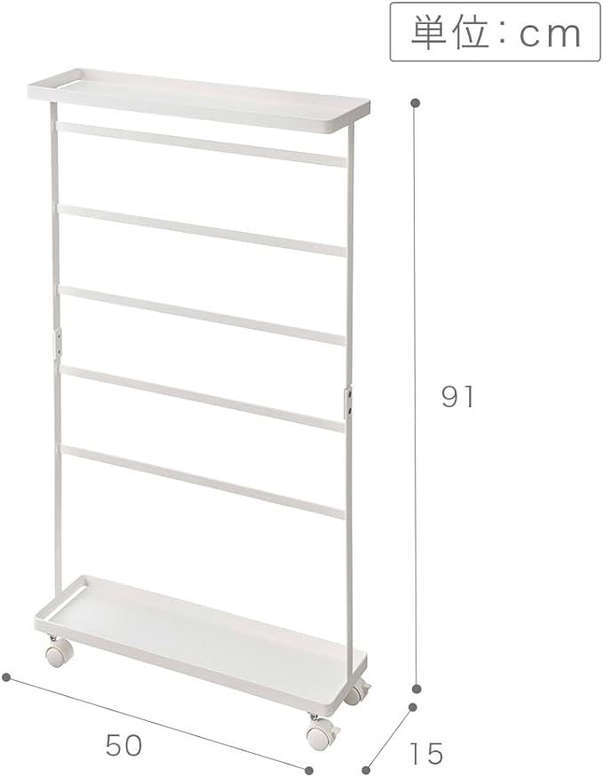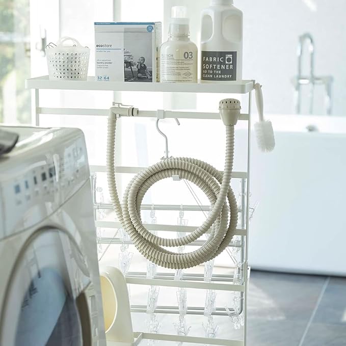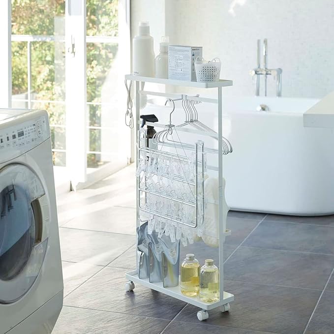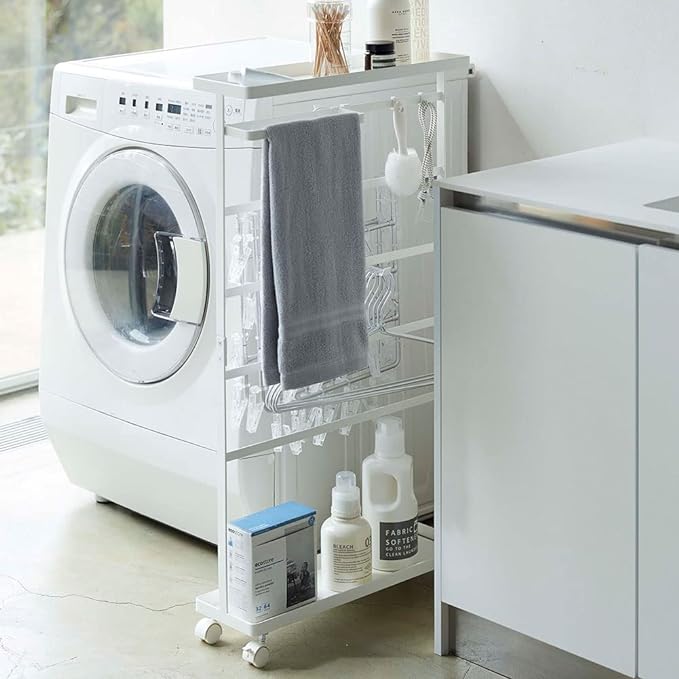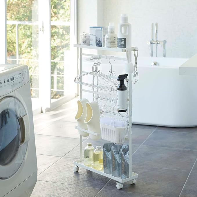 ランドリー収納はコレで決まり。洗濯用品収納ワゴン 洗剤やハンガーなどランドリー空間で必要なものがすっきりと収納できる洗濯用品収納ワゴンです。キャスター付きなので、お掃除の際の移動もラクラク。付属のホックや引っ掛けホルダーは取り付け位置のアレンジが可能なので、自分の使いやすいようにカスタマイズできちゃいます。フック大にはハンガー、フック小にはブラシなどの小物を、引っ掛けホルダーにはバスブーツやタオルの収納に最適です。脱衣所に合わせやすい、2色のカラーバリエーション カラーは、明るい印象のホワイトと、スタイリッシュなブラックをご用意しました。どんな空間にもマッチしやすいシンプルなカラーです。脱衣所やバスルームのインテリアに合わせて、お好きなカラーをお選びください。びっくり。スリムなのに大容量 サイズはキャスターを含めて、横幅50cm×奥行き15cm×高さ91cmです。スリムなので、置く場所に広くスペースを確保しなくていいのがうれしいポイント。上部と下部についているトレーは内寸49cm×14cmあるので、洗剤や柔軟剤などを置けるスペースになります。用途に合わせて2ヶ所のトレーを使い分け 上部のトレーには毎日使う洗剤や柔軟剤、漂白剤。フックや引っ掛けホルダーにはハンガーや洗濯ホース、手拭き用のタオルを。下部のトレーには洗剤のストックなどあまり頻繁に使わないものを置いておくなんて使い方もできちゃいます。バス用お掃除グッズも一緒に収納 バスシューズやバス用洗剤、ブラシ、水切りワイパーなどのバスルーム用お掃除グッズも洗濯用品収納ワゴンにまとめて収納が可能です。キャスターでバスルーム近くまでまるごと運んでくれば使用後の片付けもスムーズ。