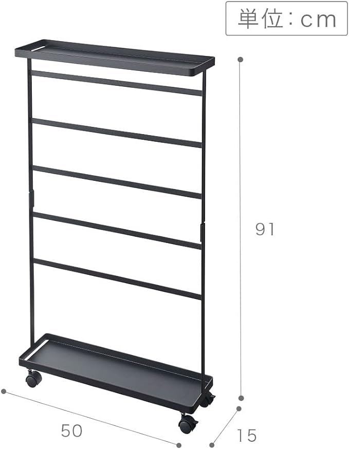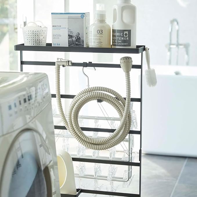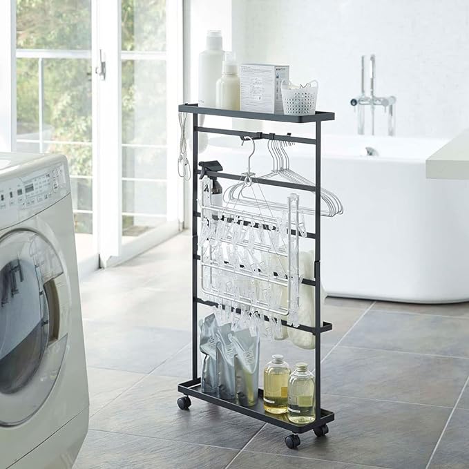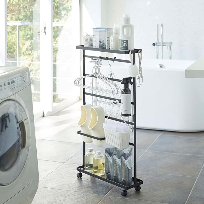 洗濯用洗剤・ハンガー・小物類などのランドリーグッズをまとめて収納できるスリムな大容量ワゴン。付属のフックや引っ掛けホルダーで自分仕様にアレンジして収納。キャスター付きだから掃除の際の移動も簡単。上部トレーは、洗剤ボトルなどを収納でき洗濯作業もスムーズに。下部トレーはバス用品のストック収納にも。フック(大)にはハンガーの収納に。フック(小)はブラシなどの小物収納に。引っ掛けホルダーはバスブーツやタオルの収納に便利。