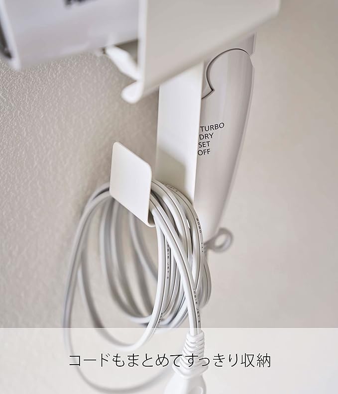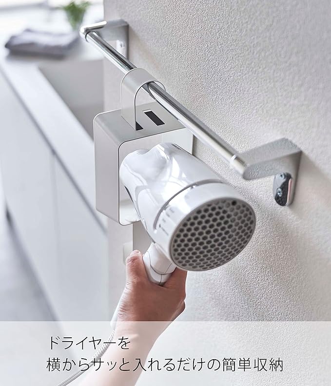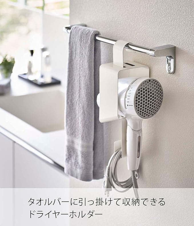 タオルバーに引っ掛けてドライヤーを収納。タオルバーに引っ掛けて収納できるドライヤーホルダー。ドライヤーは横からサッと入れるだけの簡単収納です。フックが脱着式だから、左右どちらからでも収納できます。コードもまとめてすっきり収納。接地面には、シリコーンの滑り止めクッションが付いていてドライヤーを痛めません。引っ掛けフックはマグネットでホルダーに簡単取り付け。洗面室に合いやすい2種類のカラーバリエーションカラーは、明るい印象のホワイト、スタイリッシュなブラックをご用意しました。どんなインテリアとも馴染みやすいカラーです。洗面室やベッドルームなど、普段ドライヤーを使うお部屋のインテリアに合わせて選んでみてください。考えられたサイズ感で使い勝手GOOD。あらゆるサイズのドライヤーに対応できるよう、差込口は大きめ設計。コードの収納部も余裕をもたせてあります。全長が30cmなので、タオルバーに設置すれば、ドライヤーを使いやすく、収納しやすい高さになります。使い勝手抜群。差し込むだけのドライヤーホルダーホルダー横からサッと取り出すだけで、すぐにドライヤーを使えるのがとても便利。片付けも横から差し込むだけなので手間がかかりません。シリコーンの滑り止めクッションでドライヤーの前滑りを防止し、設置面にキズが付かないよう配慮されています。コード収納もバッチリ。ゆるっとまとめて引っ掛けまとめるのが面倒なコードも、ゆるく束ねてホルダーに引っ掛けコンパクト収納に。ドライヤー本体に巻き付けないことで、コードのねじれを防ぎ故障を防止します。フックはマグネットでホルダーに簡単に取り付けられます。