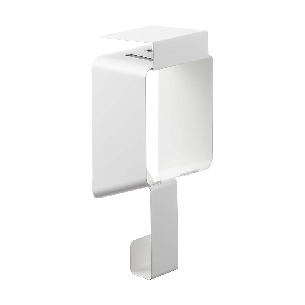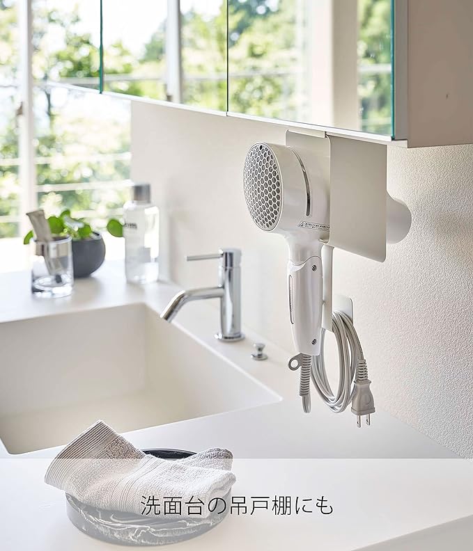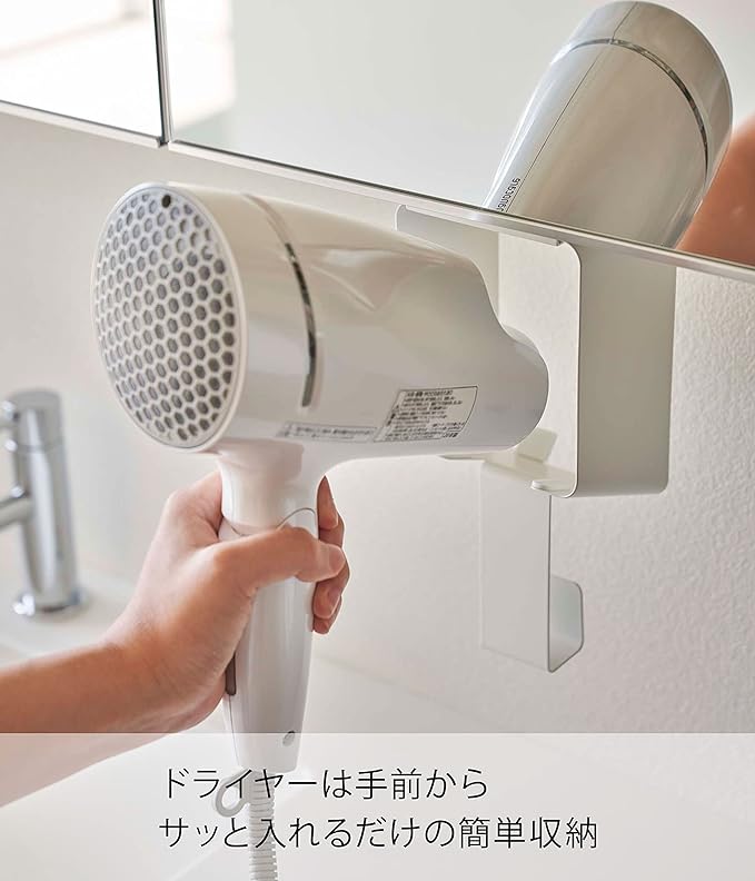 サッと差し込むだけのドライヤーホルダー 棚下に取り付けて収納できるドライヤーホルダーです。ドライヤーは手前からサッと入れるだけの簡単収納で、コードもまとめてすっきりと収納できます。接地面には、シリコーンの滑り止めクッションが付いていてドライヤーを痛めません。洗面室に合いやすい、2種類のカラーバリエーション カラーは、明るい印象のホワイト、スタイリッシュなブラックをご用意しました。どんなインテリアとも馴染みやすいカラーです。洗面室やベッドルームなど、普段ドライヤーを使うお部屋のインテリアに合わせて選んでみてください。考えられたサイズ感で使い勝手GOOD。 全長が27cmで、あらゆるサイズのドライヤーに対応できるよう差込口は大きめ設計です。コードの収納部も余裕をもたせてあります。吊り戸棚や洗面所の鏡収納などに設置すれば、ドライヤーを使いやすく、収納しやすくなります。対応可能な棚板は、棚板の厚さが1.5~2.8cm以内、幅10.8cm以上、奥行き8cm+収納するもののサイズ以上です。使い勝手抜群。差し込むだけのドライヤーホルダー ホルダーからサッと取り出すだけで、すぐにドライヤーを使えるのがとても便利です。片付けも差し込むだけなので手間がかかりません。シリコーンの滑り止めクッションでドライヤーの前滑りを防止し、設置面にキズが付かないよう配慮されています。まとめるのが面倒なコードも、ゆるく束ねてホルダーに引っ掛けてコンパクト収納を。毎日の暮らしをよりスマートに どんな空間ともなじみの良いスタイリッシュさと、使い勝手の良さを追求したのが山崎実業の『tower』シリーズ。無駄を省き洗練されたデザインは機能性にも優れていて、毎日の生活をより快適に豊かにしてくれます。