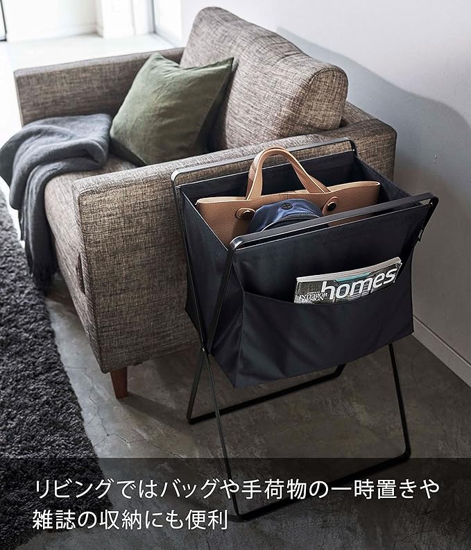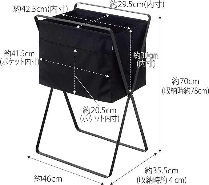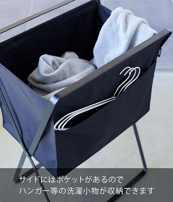 バスケットに高さがあるから、洗濯物の出し入れの際に腰への負担が軽減される、高床式の折り畳みランドリーバスケット。サイドにはポケットがついているのでハンガー等の洗濯小物を収納できます。洗濯物の持ち運びもスムーズ。折り畳んでスリムに収納できます。バッグや手荷物の一時置きや雑誌の収納にも便利。バスケットは面ファスナーで広がらないように固定できます。