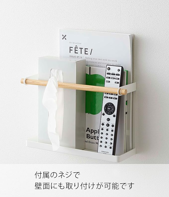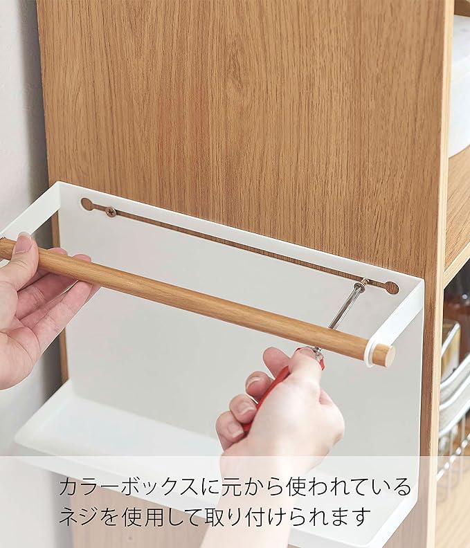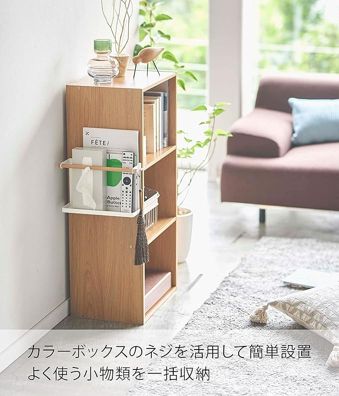 カラーボックスのネジを活用して簡単設置。ティッシュやリモコンなどよく使う小物を一括収納。天然木がアクセントになるデザインです。