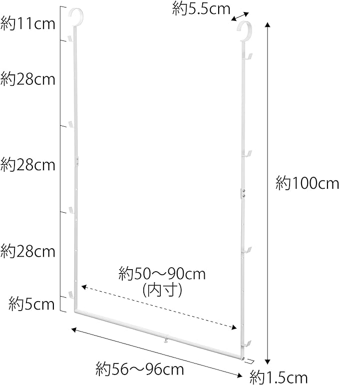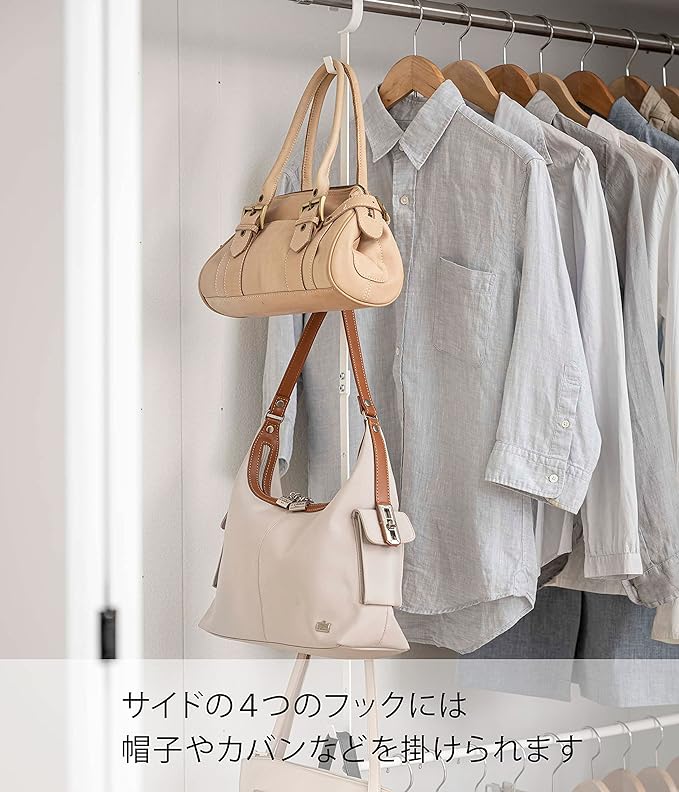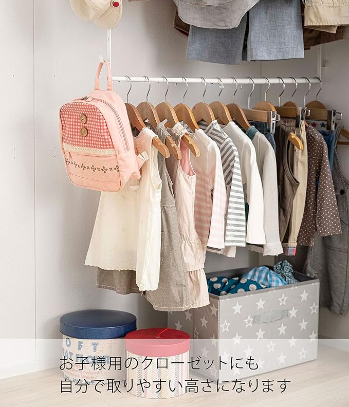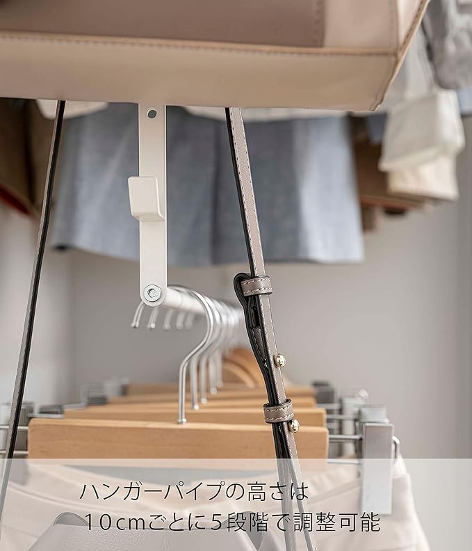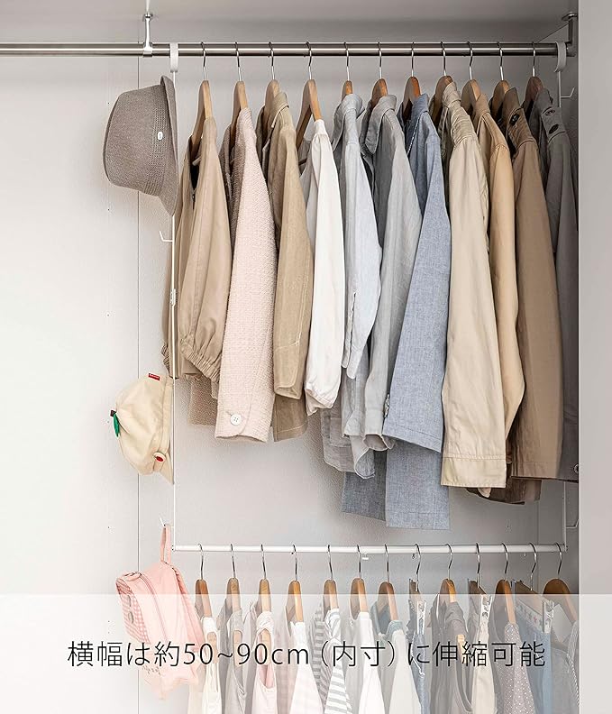 クローゼットのハンガーバーなどに掛けるだけで上下2段に収納量がアップ。幅の伸縮に加え、衣服の丈や設置場所に合わせてハンガーパイプの高さを10cmピッチで5段階調節。背の低いお子様に合わせて高さを調節することも可能。衣類下のデットスペースを有効活用。下を使うことで横のスペースが空き、さらに広く使える。