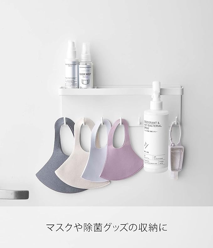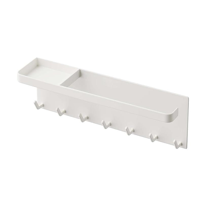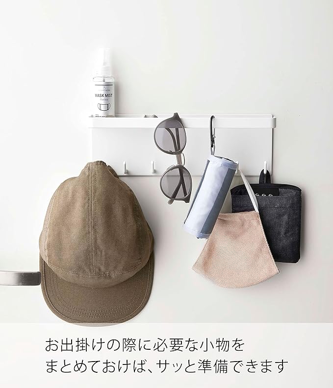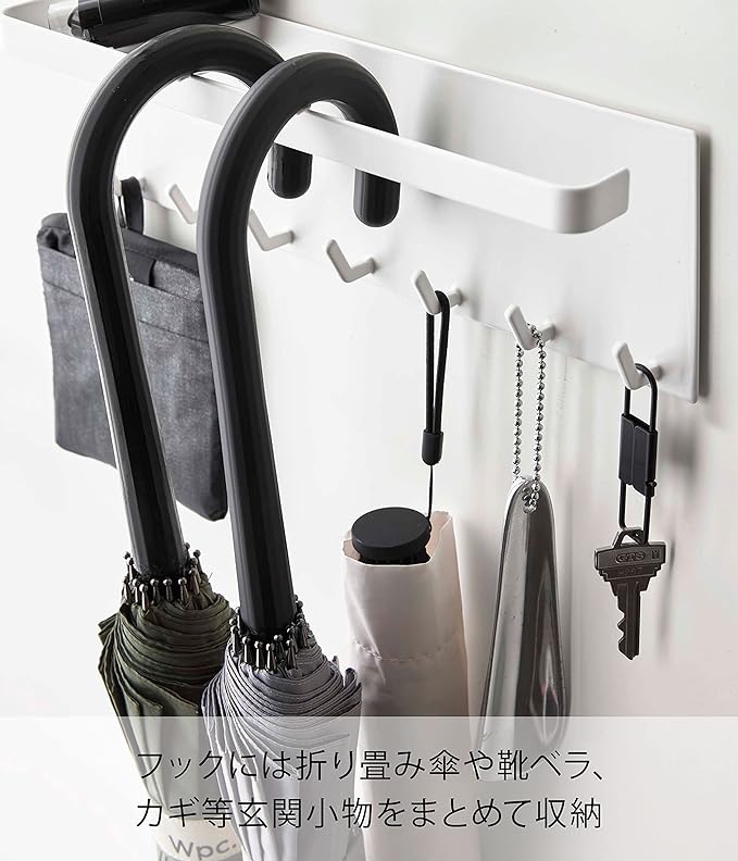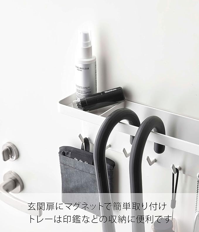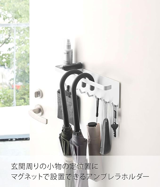 傘立てはもういらない。マグネットアンブレラホルダー 置き場所に困る長傘や折り畳み傘の置き場所に最適なマグネット式のアンブレラホルダーです。鍵やマスク、帽子なども引っ掛け収納できるので、お出掛けに必要なものはこのホルダーに一括収納。 トレー付きなので、宅配物の受け取りに必須な印鑑もここに保管できます。どんな玄関にもよく合う、2色のカラーバリエーション カラーは、明るい印象のホワイトと、スタイリッシュなブラックをご用意しました。どんなおうちの玄関にも合うシンプルなモノトーンカラーです。玄関扉の色や土間、インテリアに合わせてお好きなカラーをお選びください。玄関扉にペタッ。傘や小物もしっかりと置ける サイズは横幅28cm×奥行き7cm×高さ9.5cmで、玄関扉に設置しても邪魔になりにくいちょうどいい大きさです。マグネット式なので玄関にペタっとくっつけるだけなのもうれしいポイント。もちろん高さや場所の変更も簡単にできちゃいます。お出かけ前の準備は玄関で完結 傘だけでなく鍵や靴べラ、ファッション小物もまとめておくことで、お出かけ前の準備が玄関でできます。帰宅後はバッグから出してまとめてホルダーに戻すのを習慣化すれば、鍵など大切なものをなくしてしまう心配もありません。衣服にかける除菌スプレーも置いておけば完璧。 毎日の暮らしをよりスマートに どんな空間ともなじみの良いスタイリッシュさと、使い勝手の良さを追求したのが山崎実業の『tower』シリーズ。無駄を省き洗練されたデザインは機能性にも優れていて、毎日の生活をより快適に豊かにしてくれます。