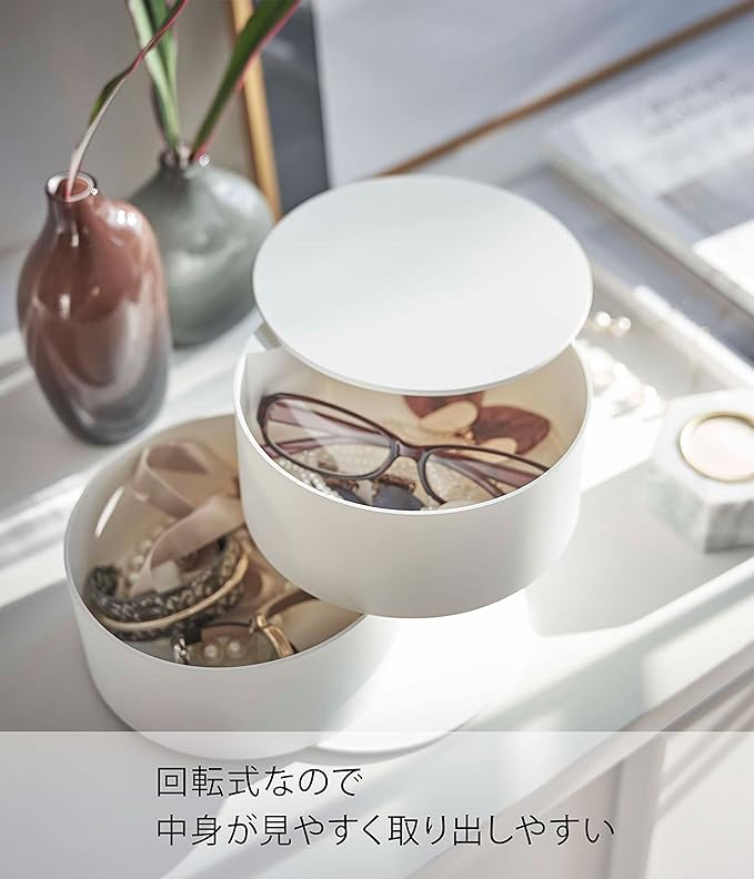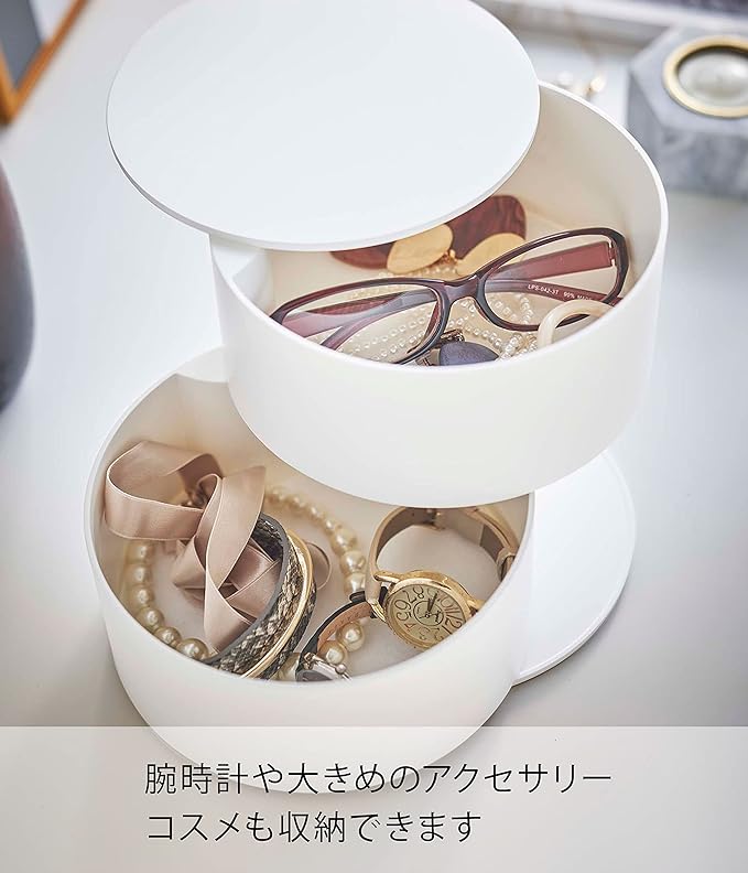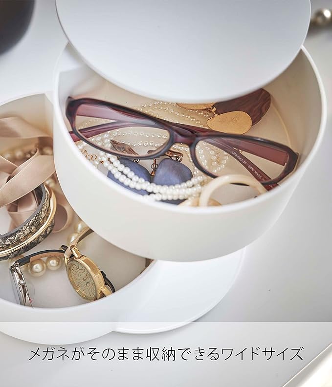 回転式で取り出しやすい。大容量の深型アクセサリートレー蓋があるのでほこりが入りにくく、トレーには深さがあるので、メガネや腕時計・大きめのアクセサリー・コスメなども収納できます。