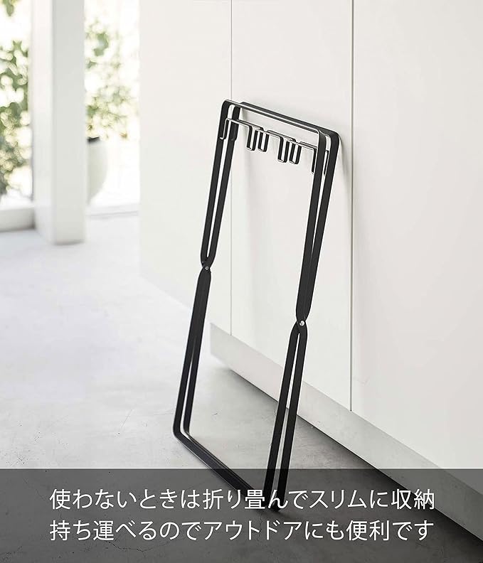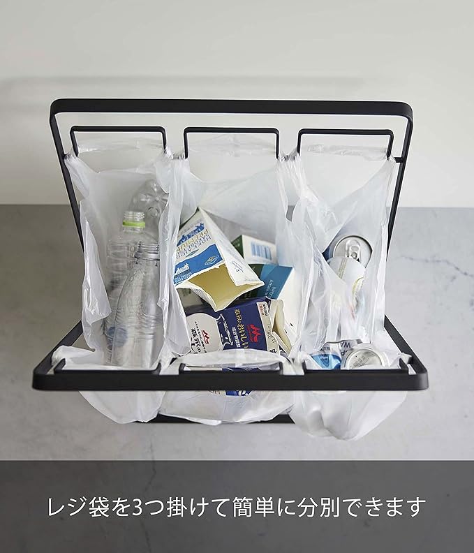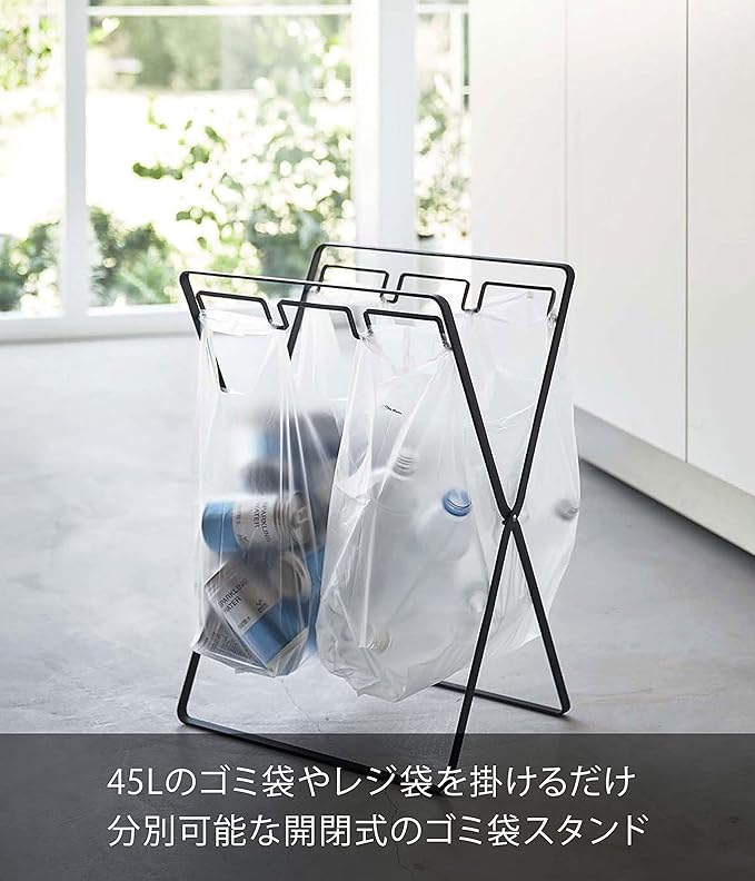 45Lのゴミ袋やレジ袋をそのまま掛けられ、分別も可能なゴミ袋スタンド。レジ袋を引っ掛けるだけで野菜クズや食品トレーなどの資源ゴミを、手軽に捨てることができます。空き缶やペットボトルの分別も可能。付属のフックに分別バサミ等の小物を掛けられます。付属のフックで袋のズレを防ぎます。