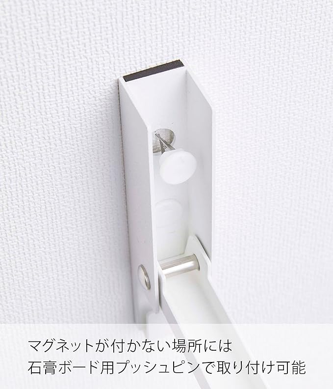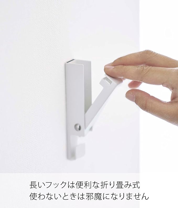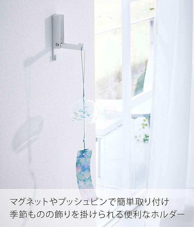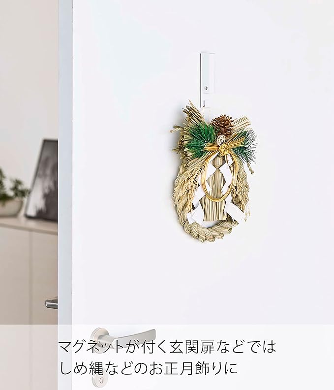 お部屋の飾り収納にぴったりなホルダー お正月のしめ縄や夏に飾ることの多い風鈴など、季節ものの飾りを収納するのに便利なホルダー。マグネットでも、壁の穴が目立ちにくい石こうボード用プッシュピンでも二通りの方法で簡単に取り付けられます。余計なデザインのないシンプルさが、飾りの魅力を引き立ててGOOD。 インテリアになじみやすい、2種類のカラーバリエーション カラーは、明るい印象のホワイトと、スタイリッシュなブラックをご用意しました。どんなインテリアとも合わせやすいシンプルなカラーピングです。壁紙の色やお部屋の雰囲気に合わせて、お好きなカラーをお選びください。開閉式フックで未使用時はスマートに 折りたたみ式のフックで使わないときはスマートに収納が可能。また折りたたみ式フック収納時でも下部の短いフックはお使いいただけるため、飾るものの大きさなど用途に合わせて2種類のフックを使い分けられます。おしゃれリースを飾って しめ縄や風鈴のほか、クリスマスリースを飾るのにも役立ちます。最近ではクリスマスに限らずハロウィーン用などイベントにちなんだリースや、季節に合わせた花や葉物、木の実を使ったオリジナルリース作りも盛んです。ぜひホルダーに素敵なリースを飾ってお部屋を彩ってみてください。毎日の暮らしを豊かに、スタイリッシュに どんな空間ともなじみの良いスタイリッシュさと、使い勝手の良さを追求したのが山崎実業の『tower』シリーズ。無駄を省き洗練されたデザインは機能性にも優れていて、毎日の生活をより快適に豊かにしてくれます。