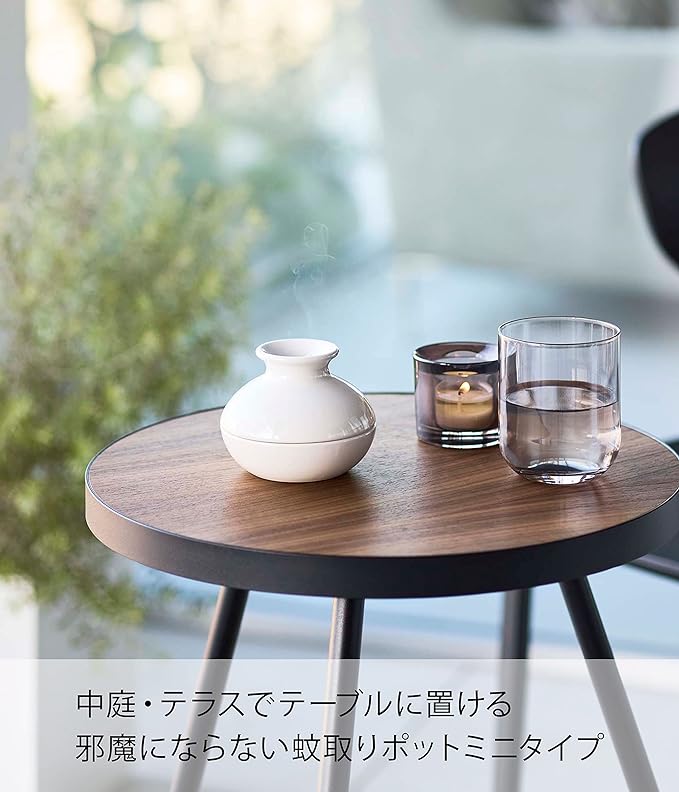 中庭・テラスでテーブルに置けて邪魔にならない蚊取りポットミニタイプ。3時間タイプの蚊取り線香専用で、不燃マット付きだからそのまま置いて使用できます。
