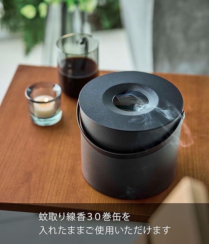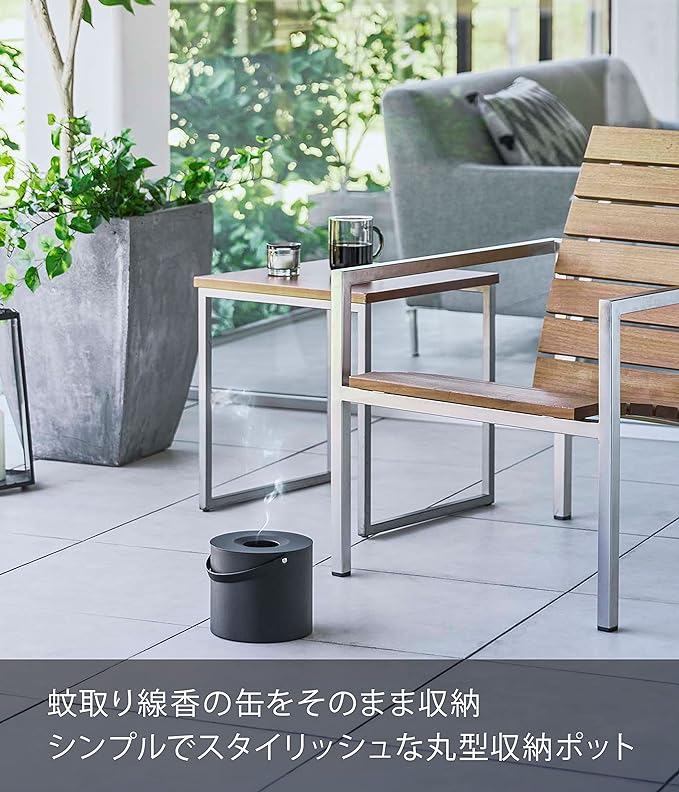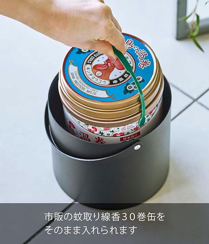 蚊取り線香のレトロな見た目を封印。専用収納ポット 夏場の必需品・蚊取り線香を缶ごと入れられる収納ポットです。特徴的なデザインの缶をスポッとまるごと隠し、スタイリッシュに使うことができます。生活感を感じさせないシンプルなブラックのワンカラーと丸形のフォルムがトレードマーク。30巻缶の蚊取り線香がすっぽりと収まる専用収納 大きさは直径17cm、高さ14cm。持ち運びしやすいハンドル付きで、設置場所の移動や片付けも簡単。家族で楽しむキャンプやアウトドアにも最適です。現地で同じく蚊取り線香を使っているグループがいても、収納ポットに入れているおかげで取り違える心配もありません。火災や事故の原因となりますので、ご使用中に収納ポットを倒したり、蓋の上に物を置かないよう十分ご注意ください。おうちのガーデニングにもぴったり お花や樹木がすくすくと成長する夏場は特にお手入れの機会が増える一方、蚊に刺される機会も増えますよね。ガーデニングのお供として蚊取り線香を使用しながら、しっかりとお庭のメンテナンスに精を出せます。収納ポットに入れたまま使える 蚊取り線香をしまうだけでなく、収納ポットに入れたまま使うことができるのがポイントです。缶をまるごと包み込むのでやけどの危険がぐっと減り、小さなお子さまのいるご家庭でも安心してお使いいただくことができます。毎日の暮らしを豊かに、スタイリッシュに どんな空間ともなじみの良いスタイリッシュさと、使い勝手の良さを追求したのが山崎実業の『tower』シリーズ。無駄を省き洗練されたデザインは機能性にも優れていて、毎日の生活をより快適に豊かにしてくれます。