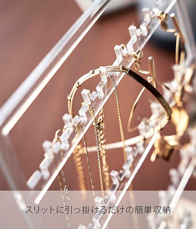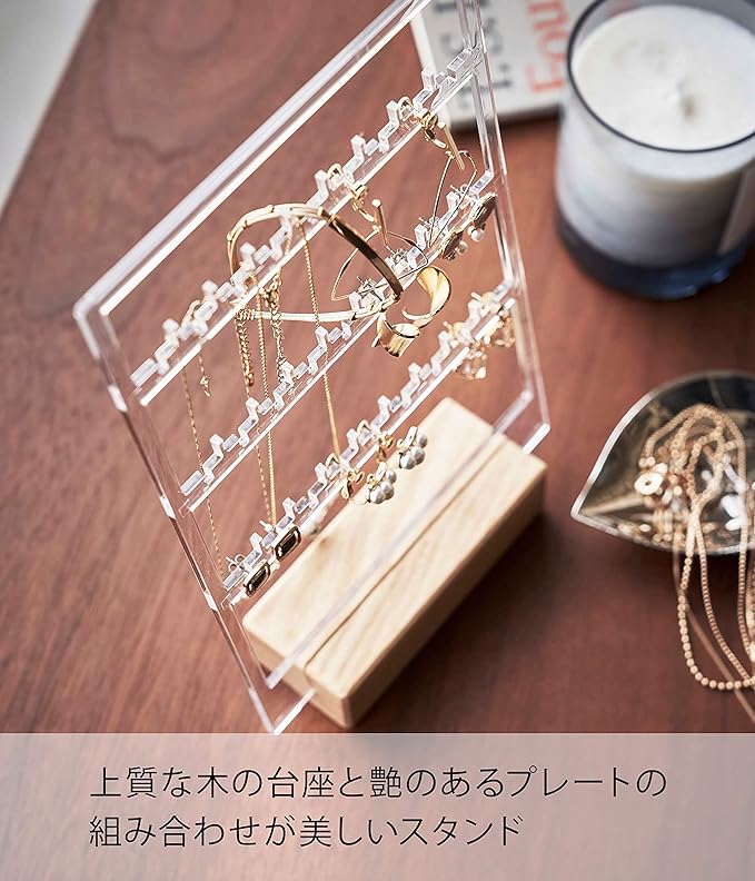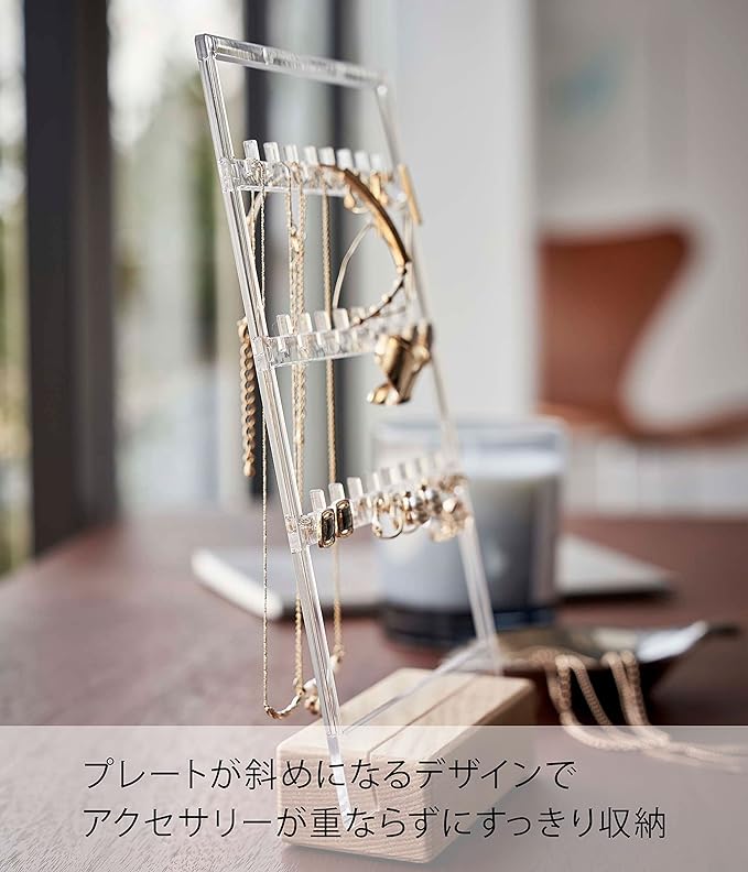 アクセサリーをディスプレイするように収納。上質な木の台座と艶のあるプレートとの組み合わせが美しいスタンドです。斜めのプレートでアクセサリーが重ならずにすっきり収納できます。スリットに上からアクセサリーを引っ掛けるだけの簡単収納。