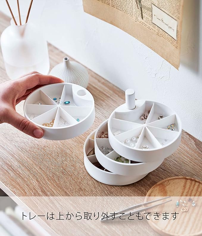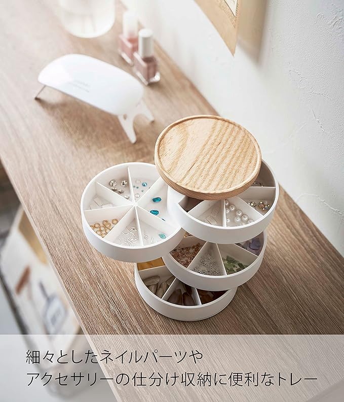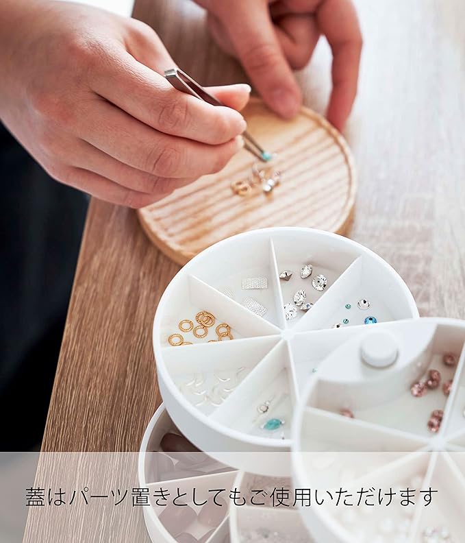 細々としたネイルパーツや小ぶりなアクセサリーを仕分けて収納。トレーが小部屋に分かれているので種類ごとにすっきりと収納できます。トレーは上から取り外して使えます。蓋はトレー状になっているのでパーツ置きとしても使えます。