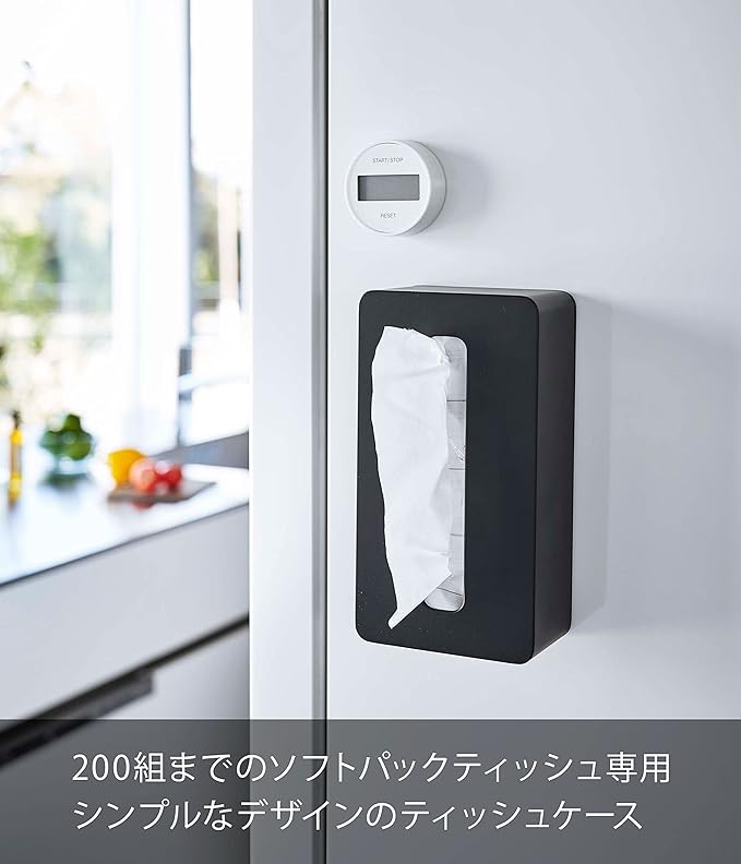 200組までのソフトパックティッシュが入るシンプルなデザインのティッシュケース。ワイドな取り出し口でスムーズにティッシュが取れます。冷蔵庫にマグネットで簡単取付。