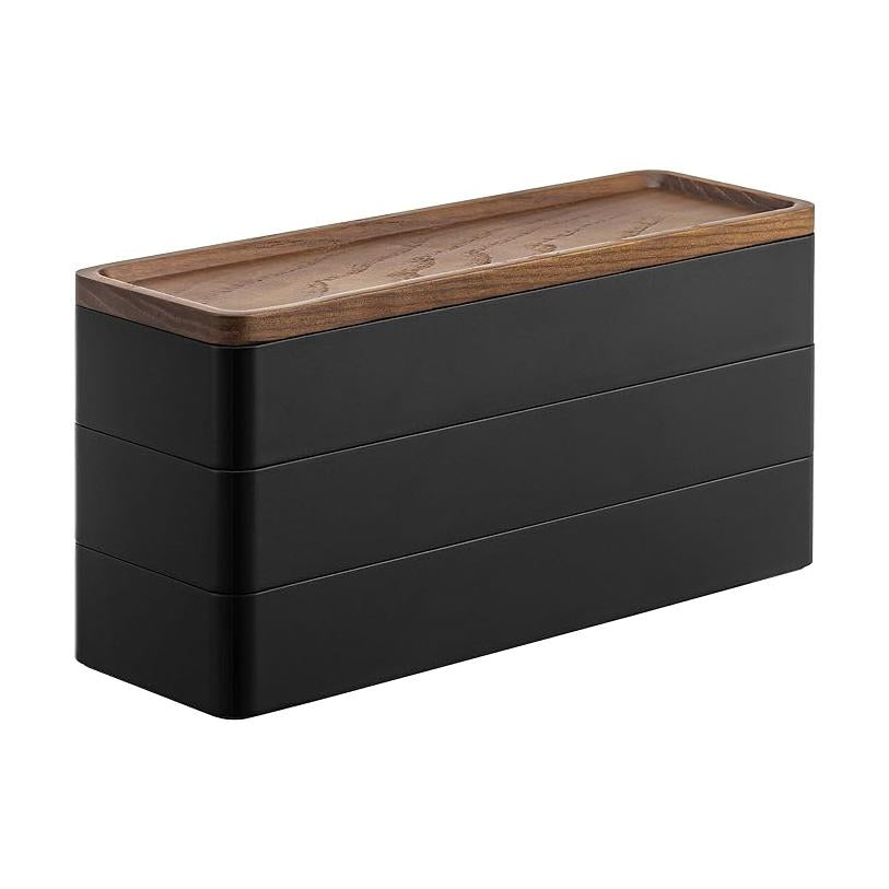 収納力抜群。3段タイプのアクセサリー収納ケース スリムな3段タイプのアクセサリーケースです。木製の蓋はフチが付いてトレーになるので、アクセサリーの一時置きにぴったり。外出先から帰ってサッと外したいときや、次の日に使うアクセサリーを用意しておきたいときなどにおすすめです。フェルトマットや仕切り板の付属で、アクセサリーに傷をつけることなくきれいに整理できます。上品で落ちつきある2色のカラーバリエーション カラーはさわやかで明るい印象を与えるナチュラル、落ちつきとクールな印象のブラウンの2色を展開しています。シンプルでスタイリッシュなデザインなので、リビングや玄関、寝室など見えるところに置いたままでもインテリアの邪魔をしません。フォルムや色合いによって生活感が出にくいのも嬉しいポイント。スリムケースで隙間収納にぴったり ケースの幅は8cmとのスリムなので、本棚やデスク上などのちょっとした隙間に収まります。長さは24cmなので、腕時計やネックレスなどの長いアイテムの収納にもぴったり。3段のトレーは上下の入れ替えや開け閉めが簡単だから、忙しい朝でもサッと取り出してしまえる便利さです。大事なアクセサリーを傷から守る アクセサリーをそのままケースに入れると傷がついてしまうこともありますが、付属のフェルトマットをケースの下に敷くことで傷がつくのを守ります。可動式の仕切りも3個付いているので、アクセサリー同士がぶつかるのを防ぎながら整理整頓が可能です。アクセサリー別に並べて使える、同シリーズ こちらの収納ケースは「アクセサリーケース3段」ですが、同シリーズには時計用のクッションがついた2段の「アクセサリー&時計ケース」もおすすめです。ケース全体の幅と高さが同じことから、タイプ別で横に並べて使用するのもおすすめです。