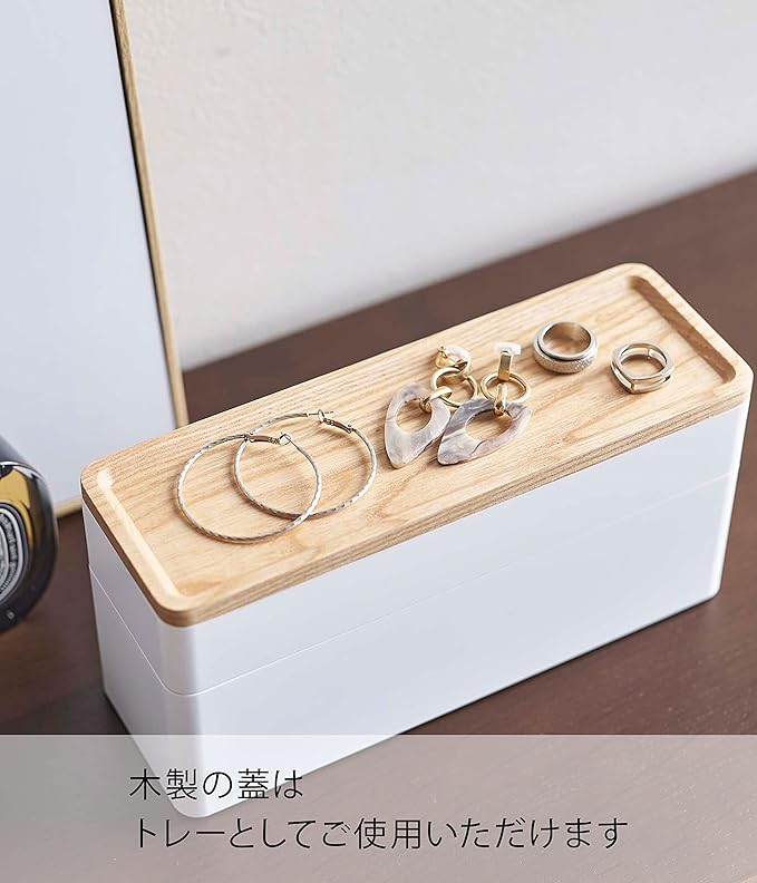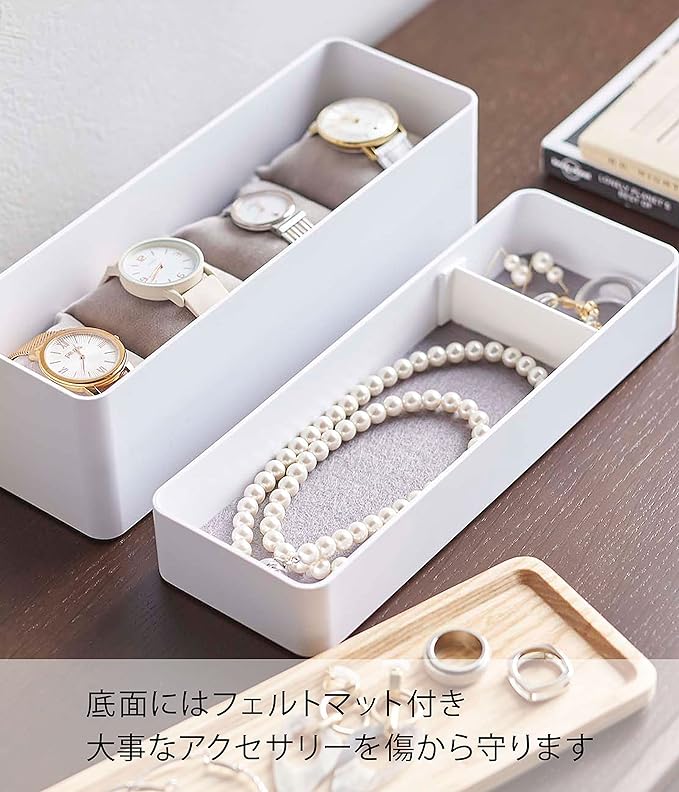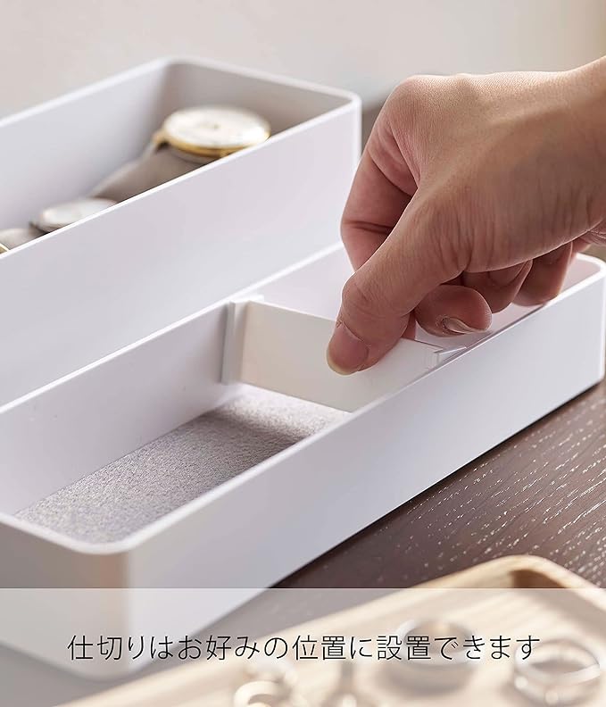 おうちの隙間に収納できるスリムなアクセサリートレー。トレーとして使える便利な木蓋つき。トレーにはフェルトマットが付いているので大事なアクセサリーを傷から守ります。お好きな場所に取り付け可能な便利な仕切り付き。クッション付き(4個)で、時計の収納にも便利。
