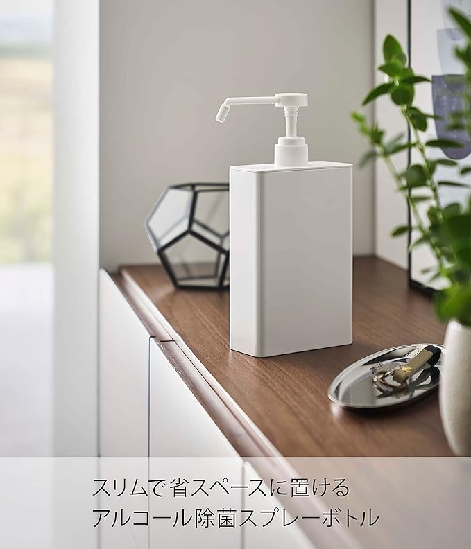スリムで省スペースに置けるアルコール除菌スプレーボトル。蓋が外れるので、詰め替えが簡単。アルコール・塩素系に対応。
