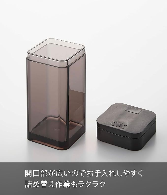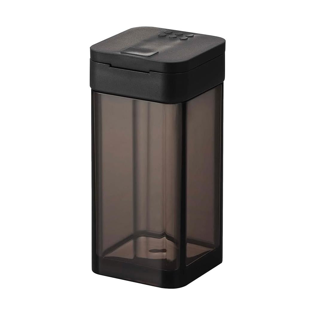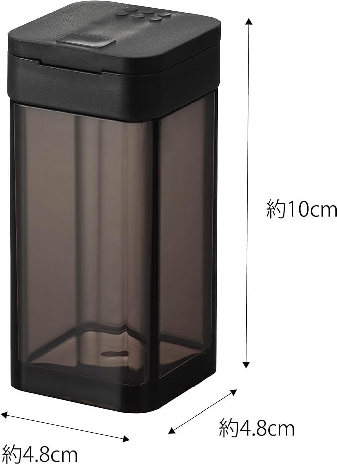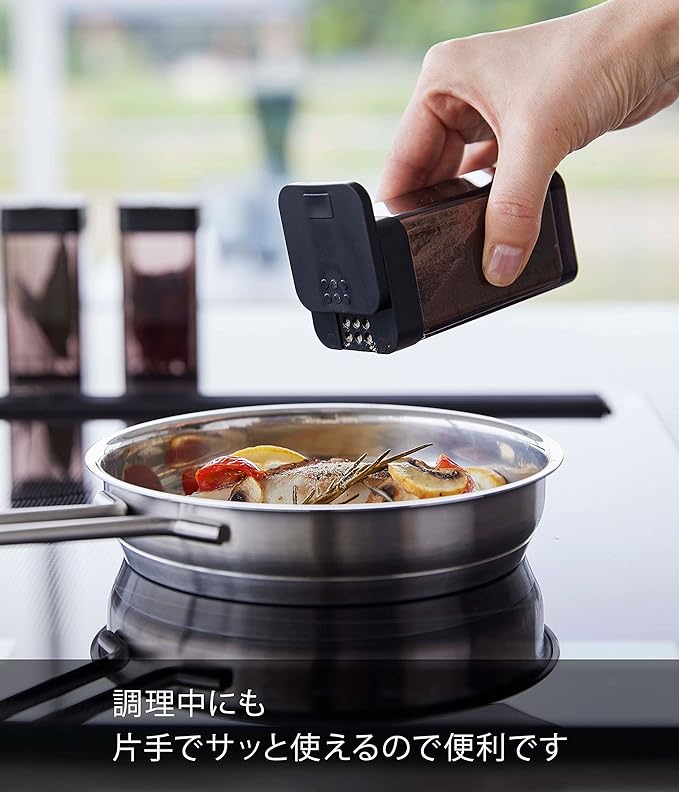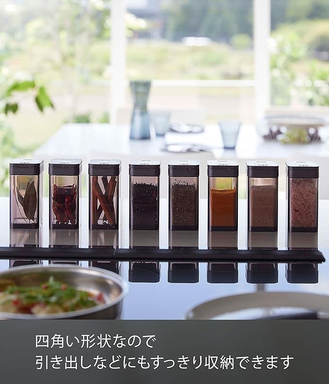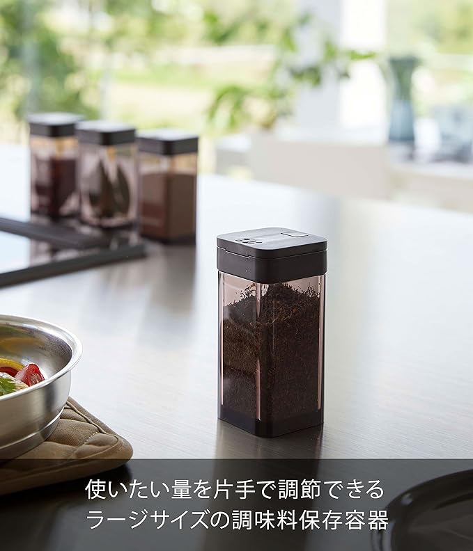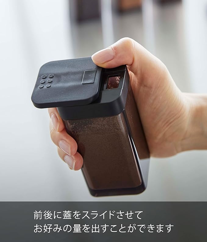 使いたい量が片手で調節できるラージサイズの調味料保存容器。前後にフタをスライドさせ、お好みの量を出すことができます。四角い形状で引き出しなどに無駄なくすっきり収納できます。