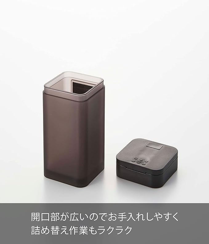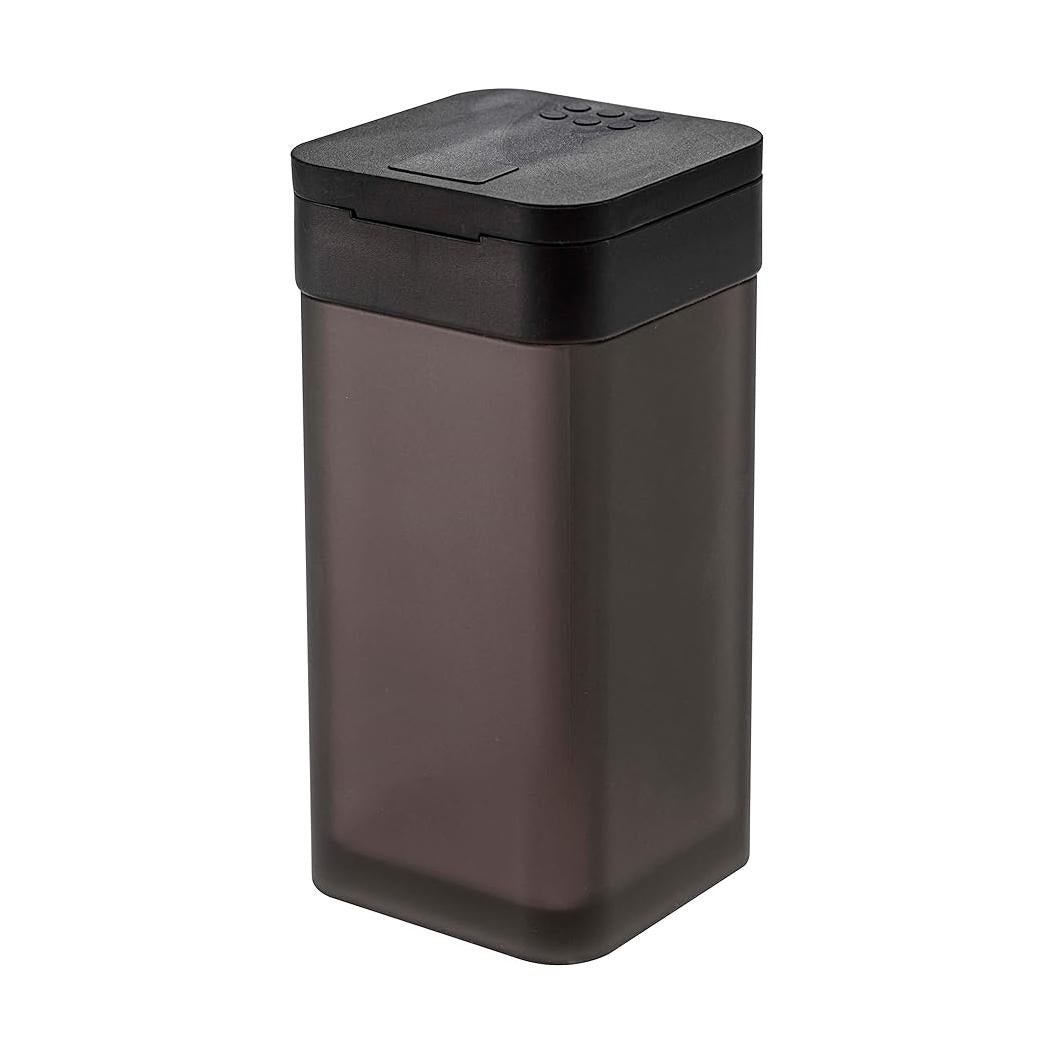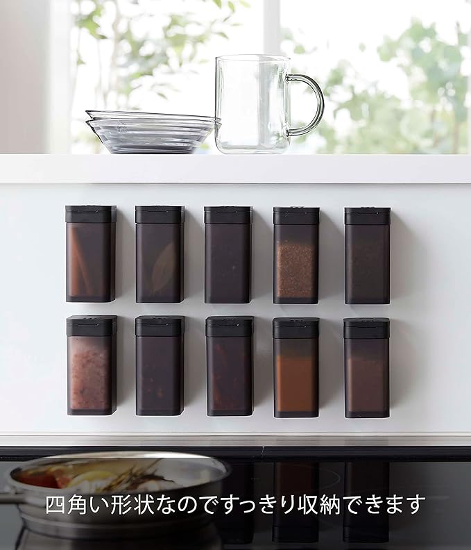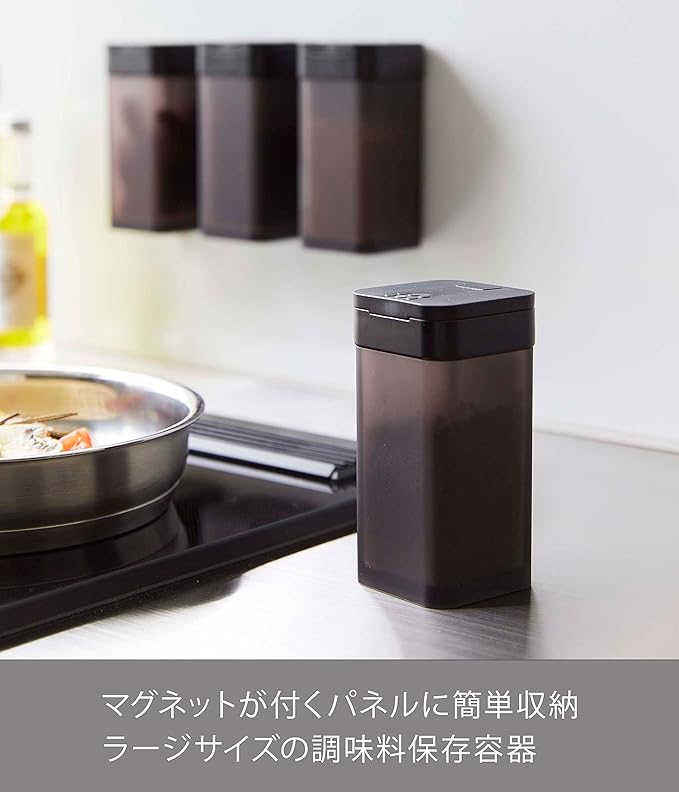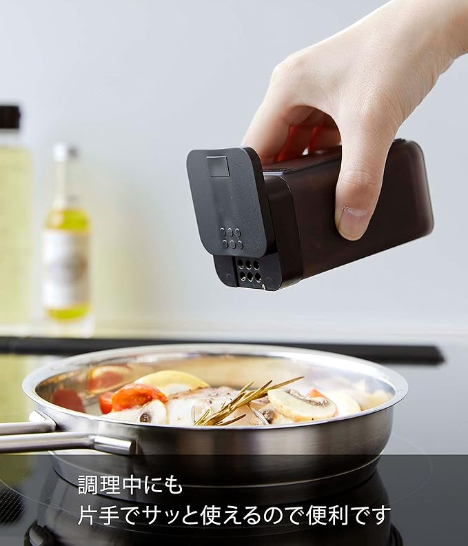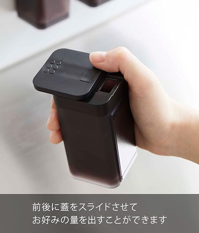 使いたい量が片手で調節できるラージサイズの調味料保存容器。前後にフタをスライドさせ、お好みの量を出すことができます。四角い形状で引き出しなどに無駄なくすっきり収納できます。