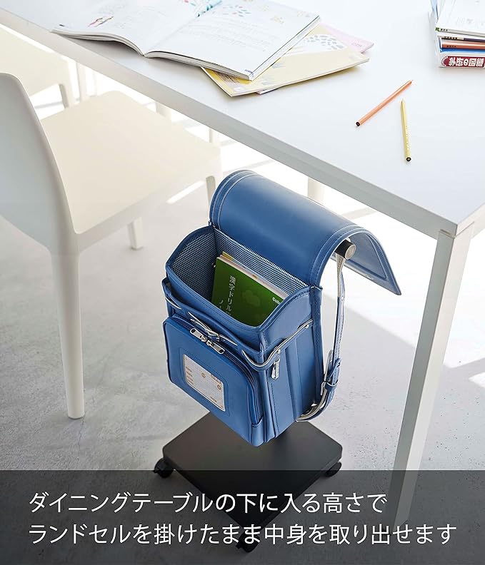 リビングでの学習にちょうどいい。ダイニングテーブルの下に入る高さのランドセル収納ワゴン。テーブルのすぐ横にランドセルを収納して、学習の準備から片付けまでをスムーズに済ませることができます。テーブルの下に入る高さで、お子様のリビング学習に最適。ランドセルを掛けたまま、中身を取り出せます。ランドセルの持ち手部分をフックに掛けても収納可能。フックには習い事のバッグや給食袋などを掛けても。園児の制服やバッグ、帽子などを玄関に収納。未就学のお子様のお片付けの練習にもぴったり。キャスター無しでも使用可能です。ランドセルの定位置に。お片付けもラクラク。台座にも本などを置くことができます。