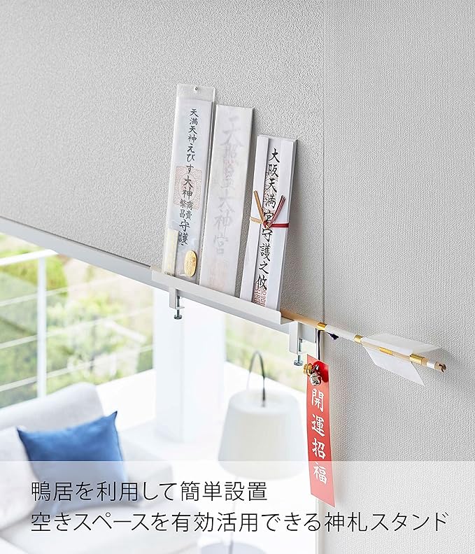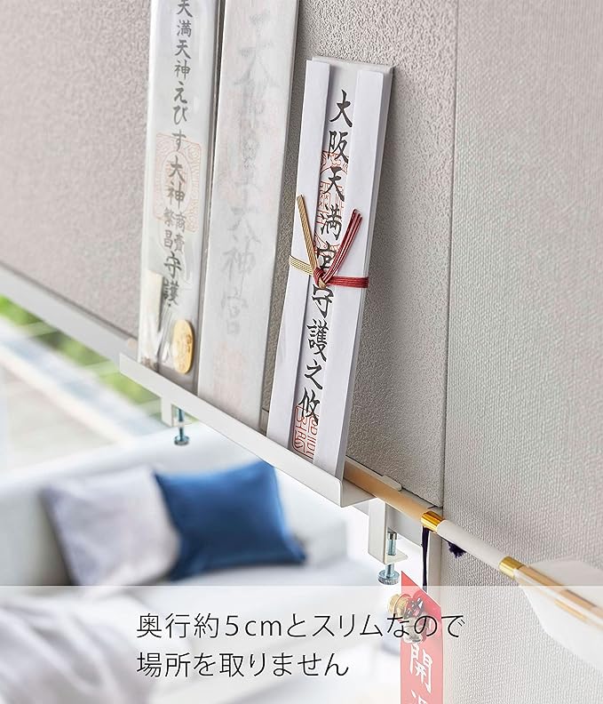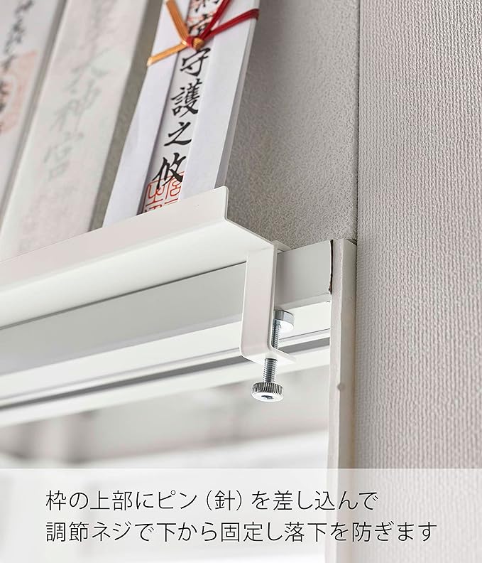 空間を有効活用する神札スタンド 神棚のないご家庭で、置き場所に困っていた神札や破魔矢をお祀りできる神札スタンドです。鴨居や窓枠、スライド扉の枠に取り付けて設置するから目線より高い場所にお祀りできます。デッドスペースを有効活用し、省スペースで設置できるアイテムです。お好みで選べる2つのカラーバリエーション 神札スタンドのカラーは、ホワイトとブラックの2種類をご用意しています。どちらのカラーもマットな素材と、シンプルでスタイリッシュなデザインのため、インテリアの邪魔をしません。洋室だけでなく和室にもしっくりなじむので、リビングやダイニングなど置きたいところに設置しやすいのがポイント。お部屋に圧迫感を感じさせないスリムなサイズ感 本体のサイズは横幅25cm、奥行4.7cm、高さ6.5~8.5cmで、耐荷重は2kgです。2~3.5cmの厚さの枠に対応しているので、ご自宅に合うスペースをお探しください。※鴨居などの形状・材質によっては荷重に弱いものがあります。取り付け前に必ず強度を確認してください。いつでもきれいを保てるスチール素材 スタンド手前にはフチが付いているので、神札が倒れないようしっかり立てられます。スチール素材のためホコリや汚れがついても乾いた布でサッと拭くだけで、いつでも簡単にお手入れ可能です。上下で挟んでしっかり固定 フック上部にある小さなピン(針)を設置する枠に差し込み、付属の六角レンチで調整ネジを締めるだけの簡単な設置です。枠を上下で挟むように設置するため、落下を防いでしっかり固定できます。※ピンが刺さる取り付け箇所には2mmほどのピン穴が残るので、穴跡が残っても差し支えのないところに取り付けください。