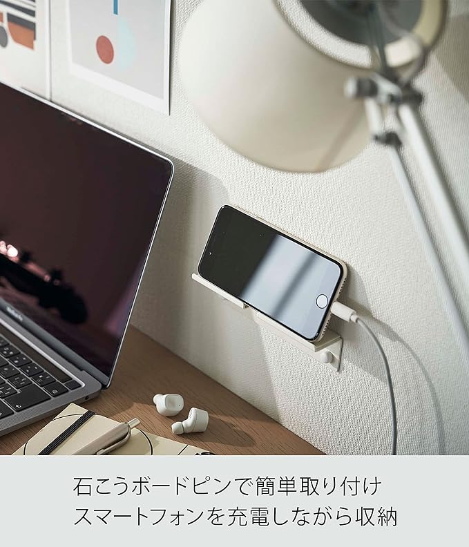 両手があく、机上がスッキリ。壁掛けスマホホルダー スマートフォンやタブレットPCに使える壁掛けホルダーです。充電ケーブルを繋いだまま使えるので長時間に及ぶご使用もバッテリー切れの心配がありません。ホルダーの中央からもケーブルを通せるので、充電中でも縦置き・横置きお好きにお使いいただけます。どんな空間にも合う、2色のカラーバリエーション カラーは、明るい印象のホワイト、スタイリッシュなブラックをご用意しました。どんなインテリアにもマッチするモノトーンなカラーリングです。お部屋の壁紙、お持ちのスマートファンやタブレットPCのカラーなどに合わせてお好みの色をお選びください。両手を離せて便利。デスクワークにも デスクの壁に設置して在宅ワークの補助に。スマホスタンドとして、サブモニター代わりに使っているタブレットPCを置くのにも便利です。仕事中はもちろん、息抜きに動画も見るときにも重宝。両手があくので作業効率も上がります。ベッド横の壁に取り付け ベッドに横になったときに見やすい位置に設置して、就寝前の動画視聴、ヒーリング動画の再生にも。朝は目覚ましとしてもベッド脇への取り付けは使い勝手が良くおすすめです。スマートフォンやタブレットPCを立て掛けていても滑りづらいシリコーンマット付き。穴が目立ちにくい石こうボードピン使用 取り付けは付属の石こうボードピンで壁に固定するだけ。(壁紙・布壁紙・薄ベニヤなど) 細いピンなので壁の穴が目立ちにくいのもうれしいポイントです。付属の木ネジを使用すれば柱・板壁・プリント合板にも取り付けが可能です。