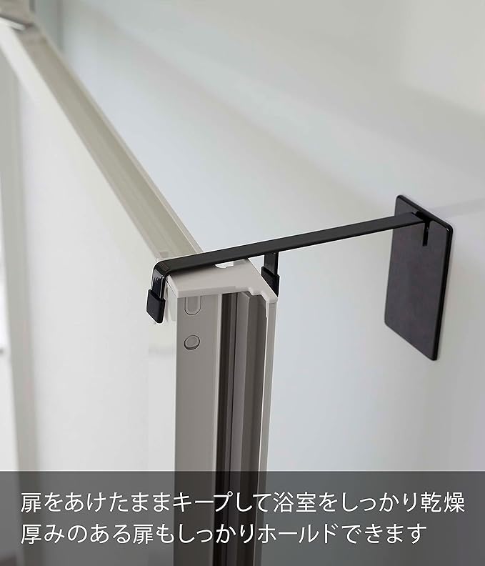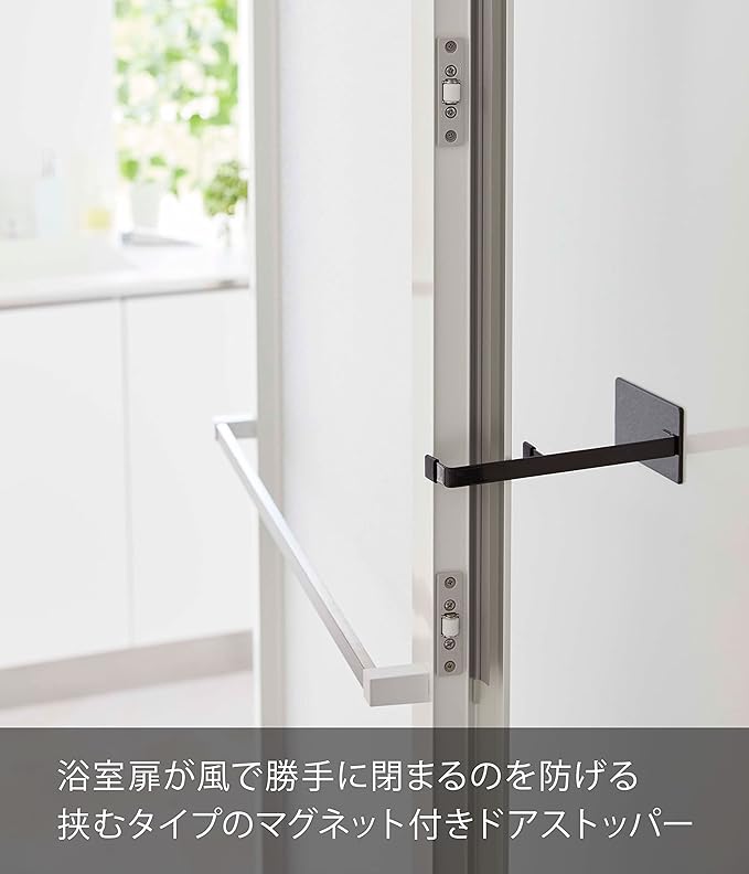 浴室扉が風で勝手に閉まるのを防いでくれる挟むタイプのマグネット付きドアストッパー。扉を開けたままキープして浴室をしっかり乾燥。カビ予防にも便利です。厚みのある扉もしっかりホールドします。シリコンキャップでドアを痛めにくい。使わないときは邪魔にならない位置に。