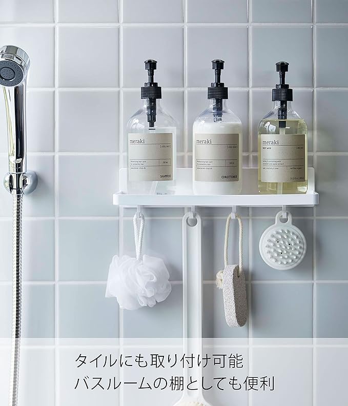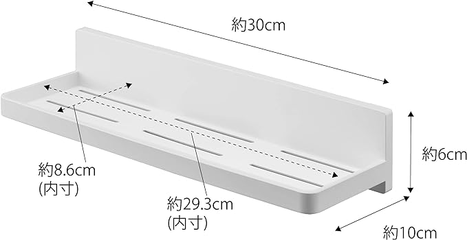 フィルムフックで好きな位置に簡単取り付けの幅30cmワイドトレー。浮かせるからぬめらず衛生的。コンタクトケア用品やメガネの一時置きに。水抜け穴があるので、哺乳瓶やグラスやマグボトルなどを干せます。スパイスボトルや調味料置きに。タイルにも取り付け可能。付属のフックを底面に取り付けて、掃除道具やケアグッズなどの小物を掛けて収納できます。