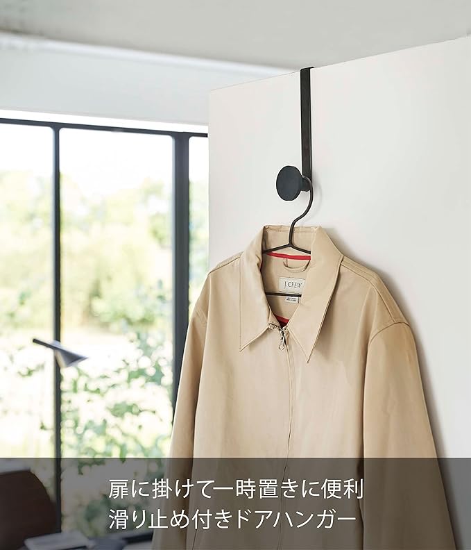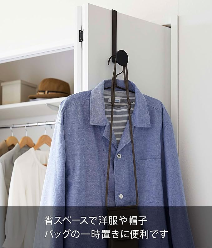 部屋のドアやクローゼットの扉に掛けるだけ。先端部分は、帽子を掛けても落ちにくいシリコーン製。リビングに合うシンプルなデザイン。省スペースで洋服や帽子、バッグなどの一時置きに便利です。ハンガー部分が長く、省スペースで2~3着の洋服を収納可能。