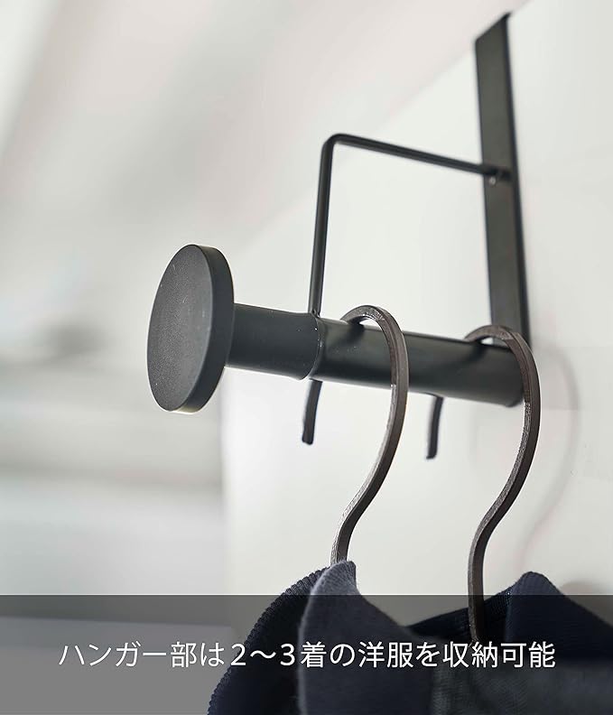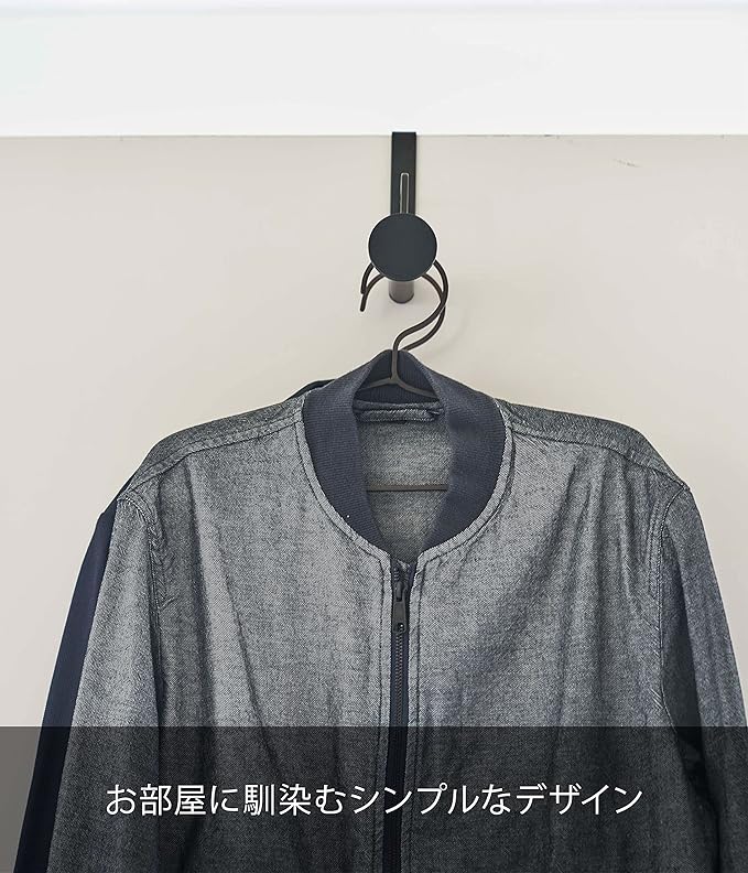 部屋のドアやクローゼットの扉に掛けるだけ。ハンガー部が長く省スペースな滑り止め付きドアハンガー。ハンガー部は2~3着の洋服を収納可能。先端部は、帽子が滑らず掛けられるシリコーン製。洋服や帽子、バッグなどの一時置きに便利。リビングに合うシンプルなデザイン。