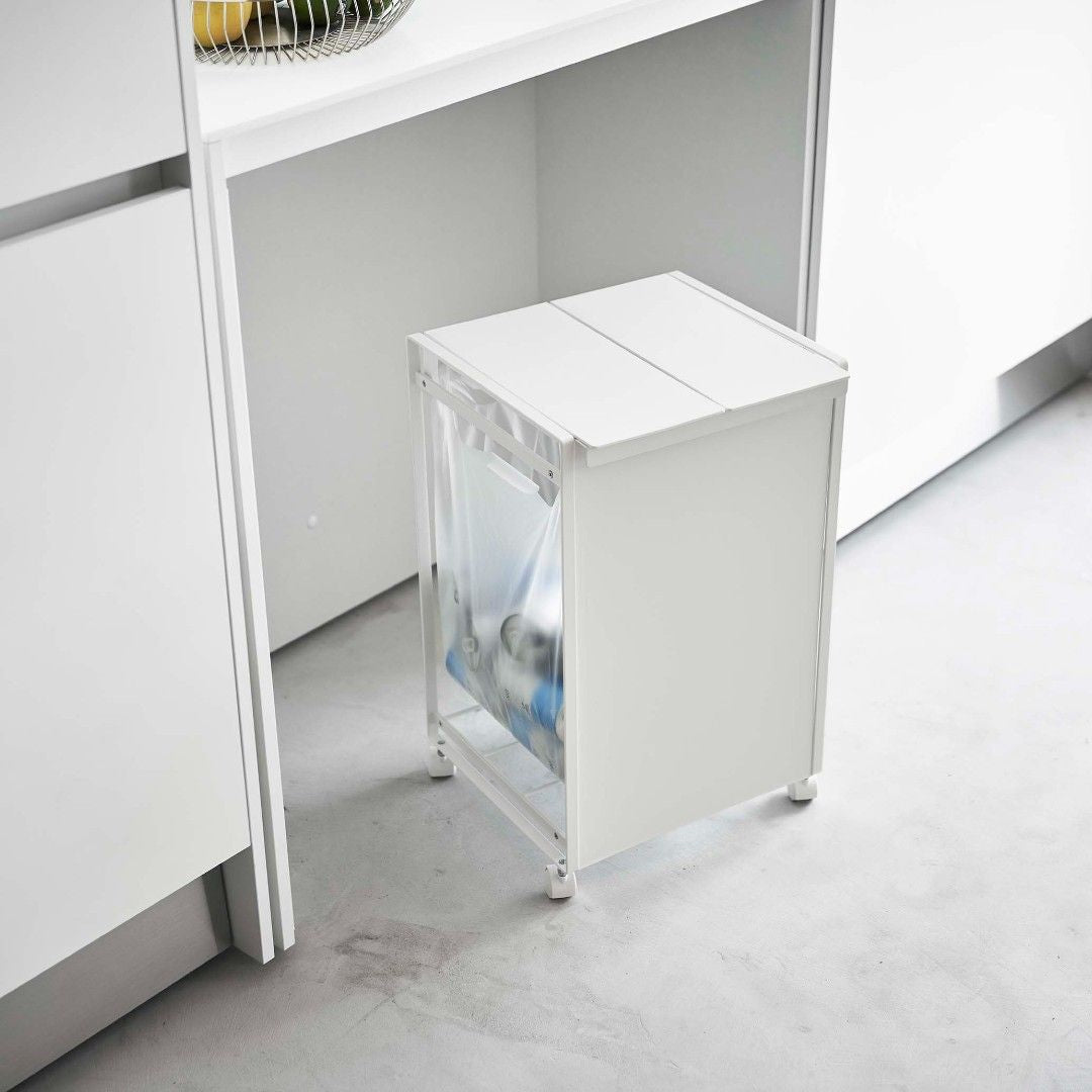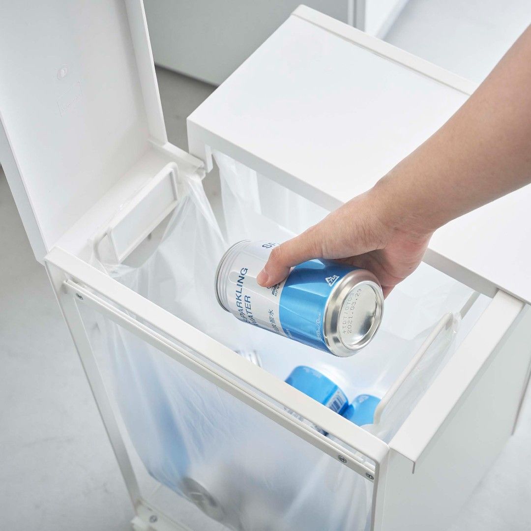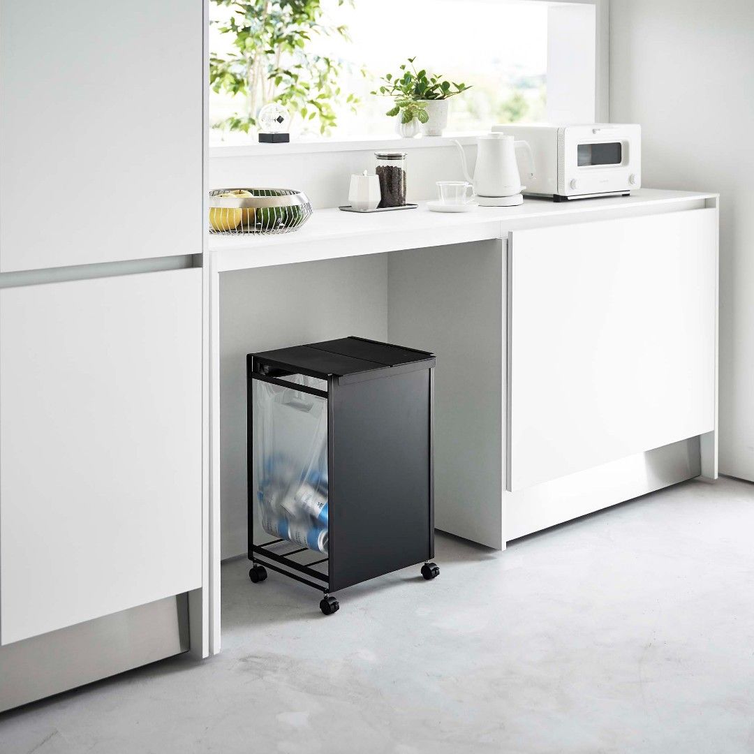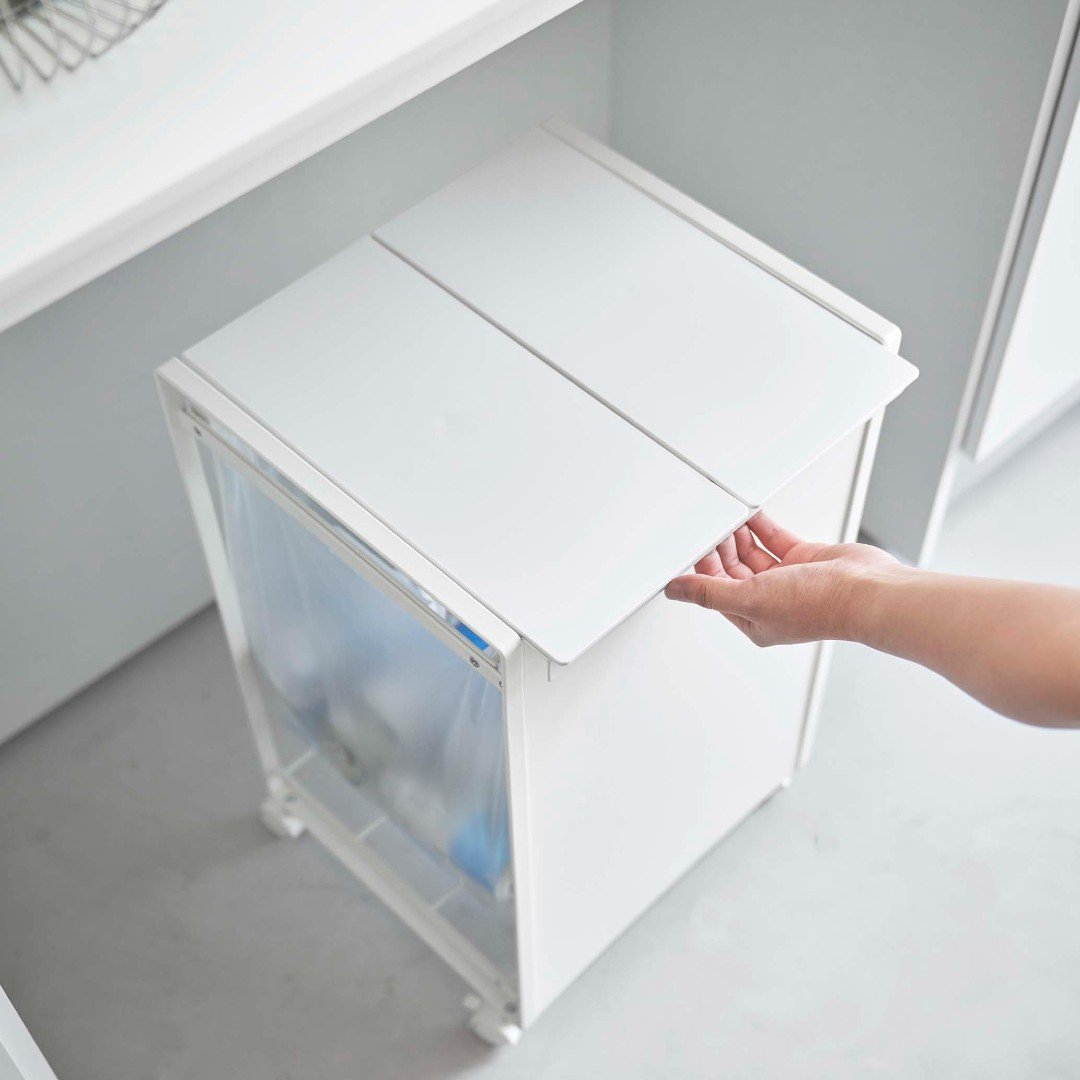 レジ袋を隠して分別ができるダストワゴン レジ袋をすっきり隠して分別できるスタイリッシュなダストワゴンに蓋付きタイプが登場です。わずらわしいゴミ袋の交換が引っ掛けるだけで完了。お手持ちのコンビニやスーパーのレジ袋も使用可能なのが魅力です。ビン・缶・ペットボトルなどを簡単に分別出来て、ゴミ袋が見えないだけで生活感をOFF出来て清潔感もアップ。蓋付きタイプで気になる臭いも防げます。移動しやすいハンドルとキャスター付きでゴミ捨ても楽にできます。カラーーはシンプルな2色 カラーは、どんなキッチンにも合わせやすいホワイトとシックな空間におすすめなブラックの2色展開です。ご自宅のキッチンに合わせて選んでみてください。90度で開けたままにできるストッパー付き 蓋は片手で開閉が可能で、ゴミ捨て時、袋の交換時に便利なストッパー付きでとっても便利。90度に開いた時に、シリコーン製のストッパーのおかげで蓋がバタバタと動くのを防いでくれます。袋のストック置き場に 本体の下面には棚が付いているので、意外とスペースを取って収納場所に困るゴミ袋の定位置に最適。ゴミ箱と一緒に収納できるので、ゴミ捨ての一連の流れがスムーズになり、デッドスペースを有効利用出来て快適です。選べる2分別と3分別 横幅35cmの2分別と、横幅50.5cmの3分別の2タイプ展開です。設置したいスペースの広さや用途によってお好みのタイプをお選びいただけます。瓶・缶・ペットボトルや燃えるゴミ・不燃などライフスタイルに合わせてご使用ください。※こちらのページは「蓋付き目隠し分別ダストワゴン 2分別」となり3分別タイプは別ページよりご購入いただけます。