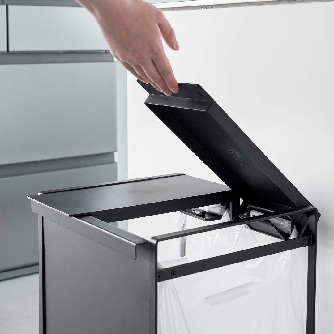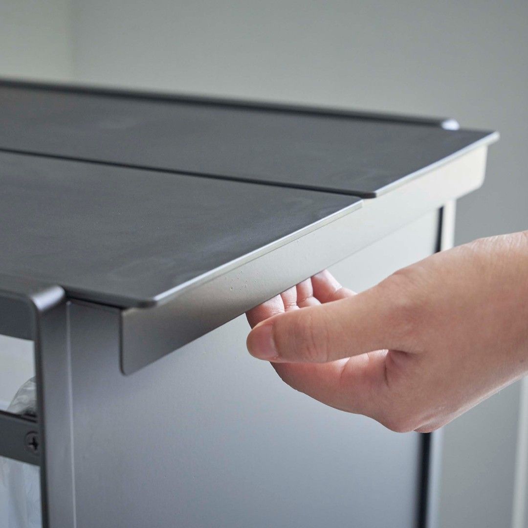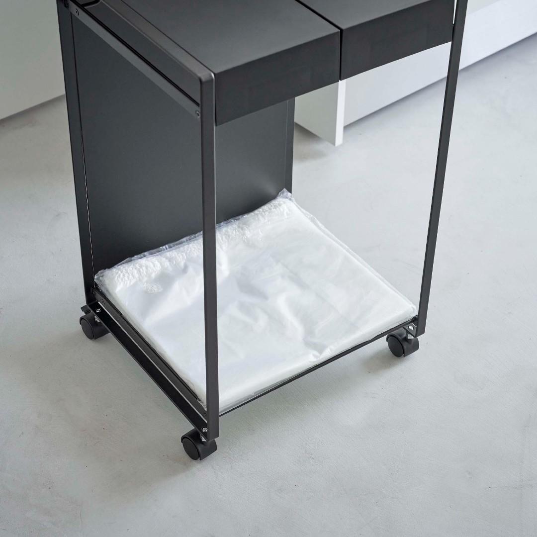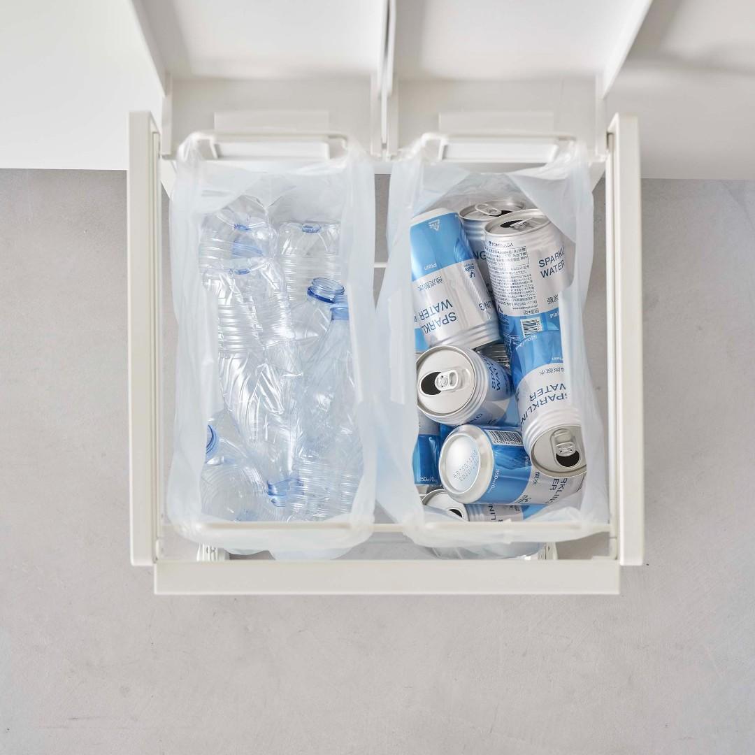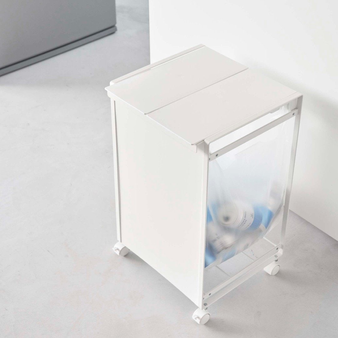 レジ袋を隠して分別ができるダストワゴン レジ袋をすっきり隠して分別できるスタイリッシュなダストワゴンに蓋付きタイプが登場です。わずらわしいゴミ袋の交換が引っ掛けるだけで完了。お手持ちのコンビニやスーパーのレジ袋も使用可能なのが魅力です。ビン・缶・ペットボトルなどを簡単に分別出来て、ゴミ袋が見えないだけで生活感をOFF出来て清潔感もアップ。蓋付きタイプで気になる臭いも防げます。移動しやすいハンドルとキャスター付きでゴミ捨ても楽にできます。カラーーはシンプルな2色 カラーは、どんなキッチンにも合わせやすいホワイトとシックな空間におすすめなブラックの2色展開です。ご自宅のキッチンに合わせて選んでみてください。90度で開けたままにできるストッパー付き 蓋は片手で開閉が可能で、ゴミ捨て時、袋の交換時に便利なストッパー付きでとっても便利。90度に開いた時に、シリコーン製のストッパーのおかげで蓋がバタバタと動くのを防いでくれます。袋のストック置き場に 本体の下面には棚が付いているので、意外とスペースを取って収納場所に困るゴミ袋の定位置に最適。ゴミ箱と一緒に収納できるので、ゴミ捨ての一連の流れがスムーズになり、デッドスペースを有効利用出来て快適です。選べる2分別と3分別 横幅35cmの2分別と、横幅50.5cmの3分別の2タイプ展開です。設置したいスペースの広さや用途によってお好みのタイプをお選びいただけます。瓶・缶・ペットボトルや燃えるゴミ・不燃などライフスタイルに合わせてご使用ください。※こちらのページは「蓋付き目隠し分別ダストワゴン 2分別」となり3分別タイプは別ページよりご購入いただけます。