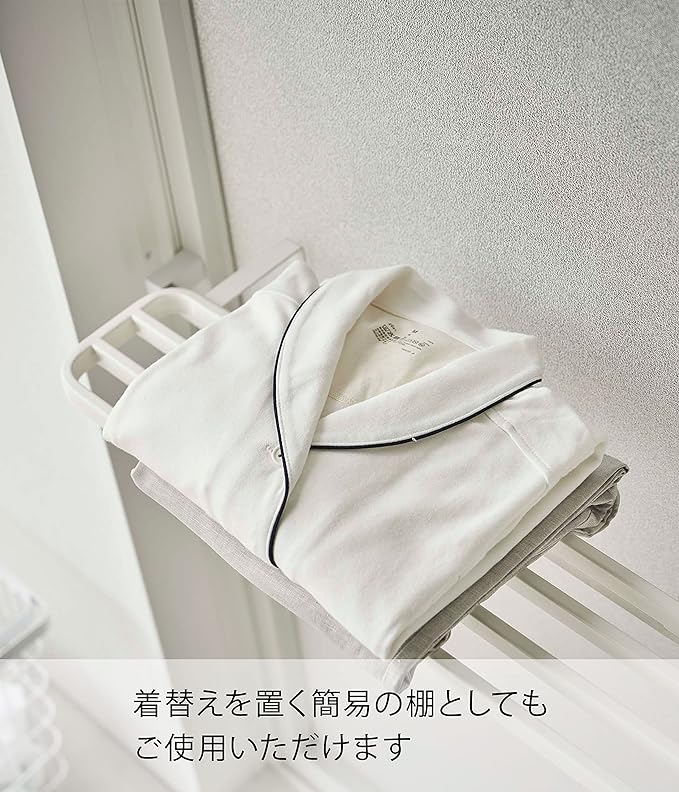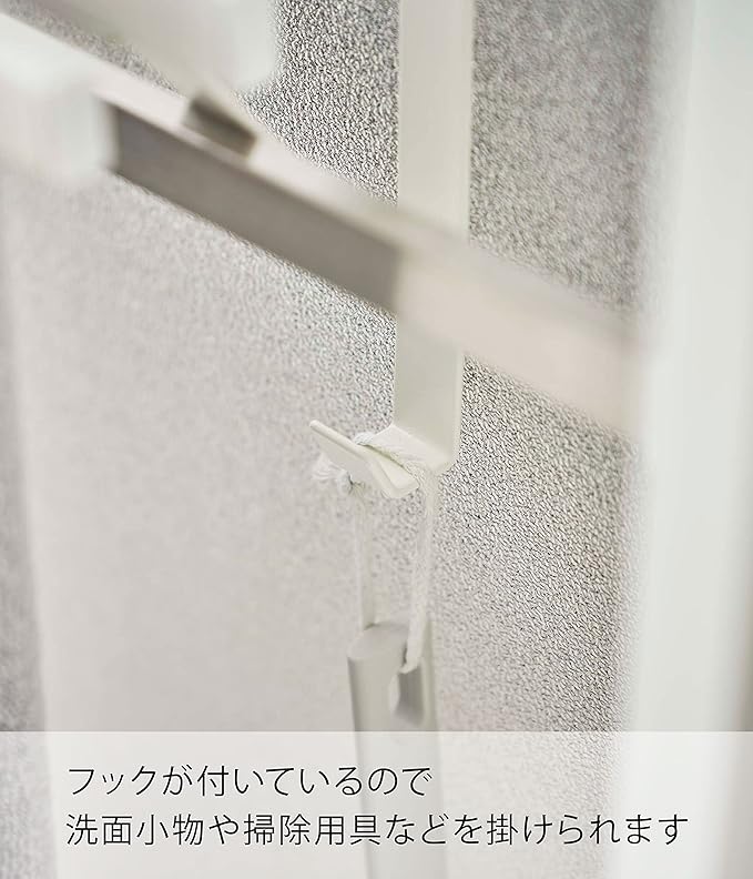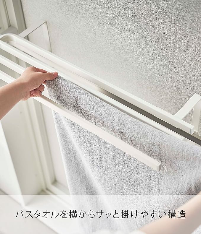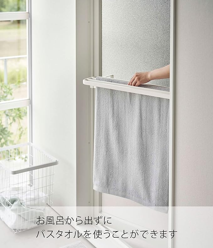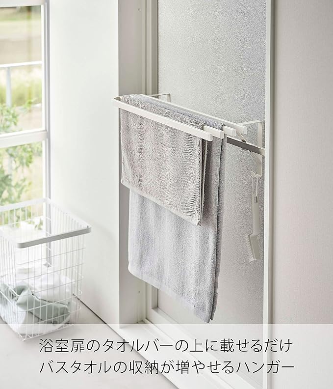 浴室扉に掛けるバスタオルの枚数を増やせるハンガー 浴室扉のタオルバーの上に差し込むだけで収納力がアップする、バスタオルハンガーです。切れ目があるので、横からスーッとタオルを掛けられます。浴室から出なくてもタオルをサッと取りたい、きれいなタオルが浴室扉に接触するのが気になる、複数のタオルを一箇所にまとめたい方におすすめのアイテムです。カラーはホワイトとブラックの2色 バスタオルハンガーのカラーバリエーションは、ホワイトとブラックの2色をご用意いたしました。どちらもマットな質感とシンプルなデザインなので、どんなテイストのインテリアにもマッチします。奥行があるから一時置きの棚としても使用可能 1本のタオルハンガーに、バスタオルを3枚かけることができます。奥行きがあるので入浴後に着るパジャマや、バスタイムを充実させるお風呂グッズなどを置いておくのにも役立ちます。ちょっとしたものを掛けられる、便利なフック付き ハンガーの先には小物などが掛けられるフックが付いています。お風呂上りにすぐ使いたいスプレーボトルや掃除用品、着替えの下着を掛けておくなどさまざまな使い方ができます。使いやすいよう掛ける向きを変更可能 バスタオルは横からサッとかけられるよう、片方だけに切れ目があります。浴室扉の開ける向きやバスタオルを掛けやすい向きに合わせて、組み立て時に切れ目の右開き・左開きを選べます。ハンガー本体は固定パーツで扉にしっかり取り付けられるので、安定感があるのも嬉しいポイント。