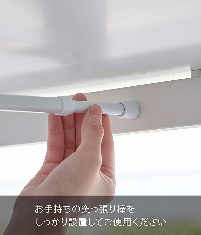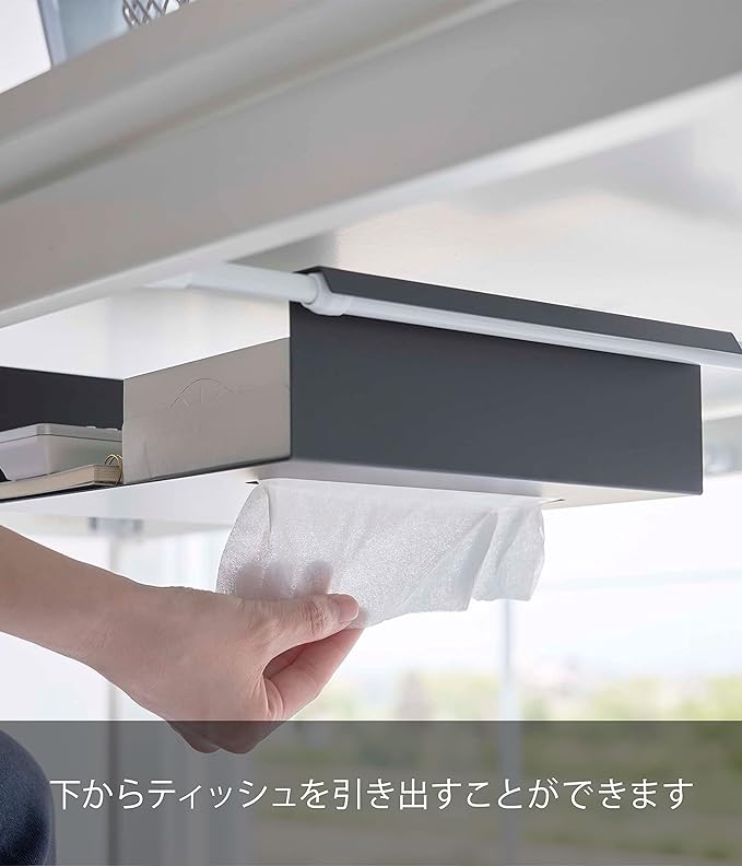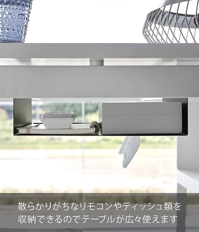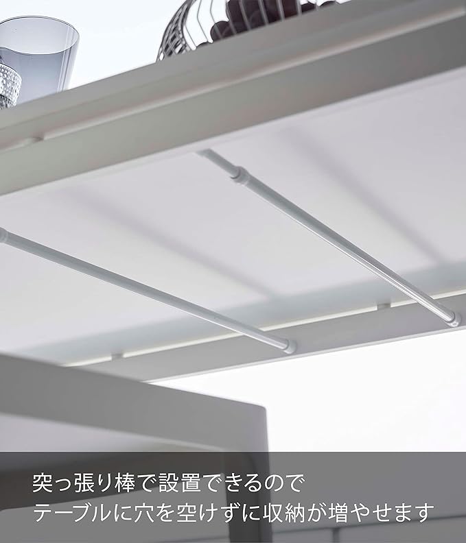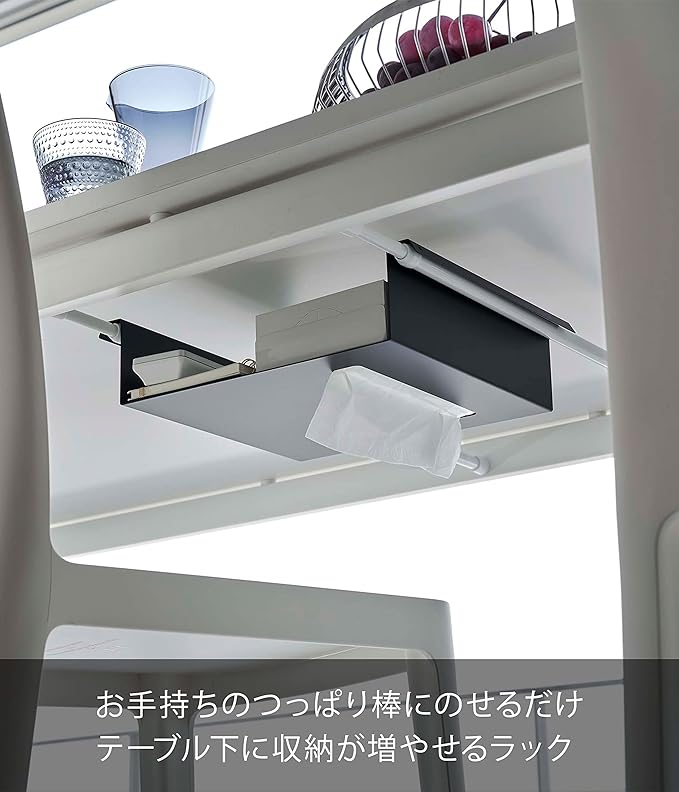 お使いのつっぱり棒にのせるだけの収納ラック。テーブルに穴を開けずに収納を増やせます。よく使うリモコンやティッシュをテーブル下に一括収納。テーブルが広々使える収納ラックです。製品底面からティッシュを引き出せて便利。