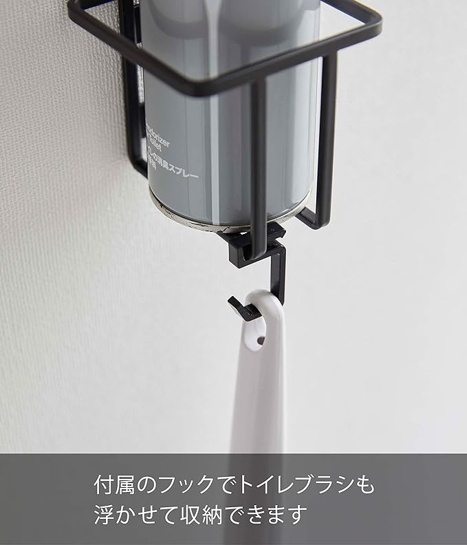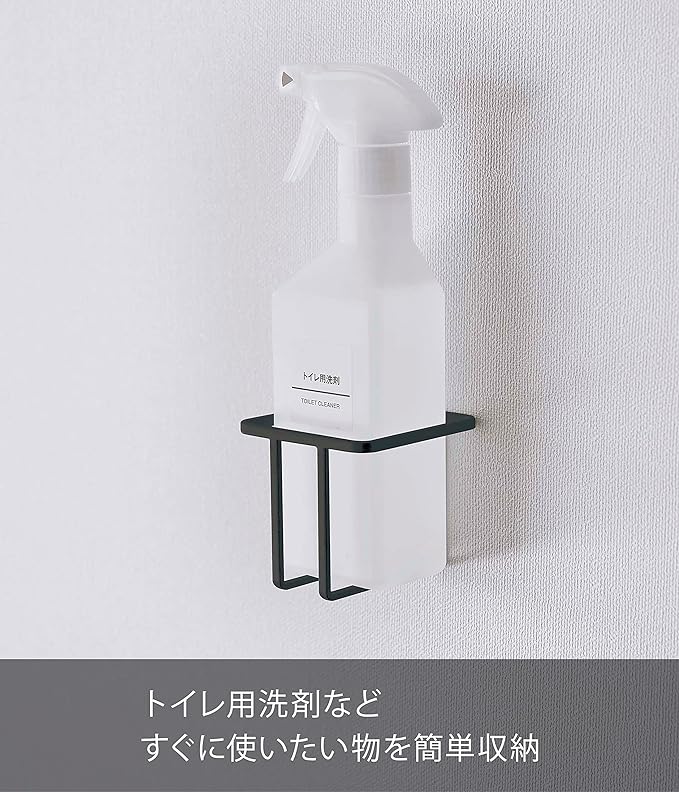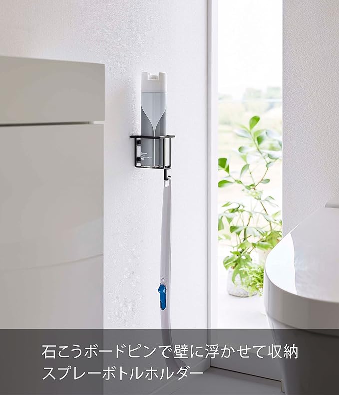石こうボードピンで壁に浮かせて設置できるスプレーボトルホルダー。付属のフックでトイレブラシも収納できます。スリムタイプのスプレーボトルにも対応。壁の穴が目立たない石こうボードピンで壁に取り付けることができます。スプレー・掃除用品など、すぐに使いたい物を簡単収納。浮かせて収納できるので、床のお手入れも簡単です。