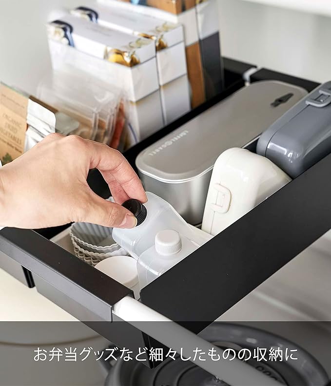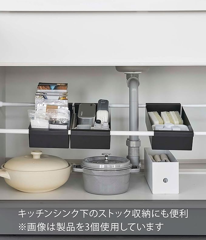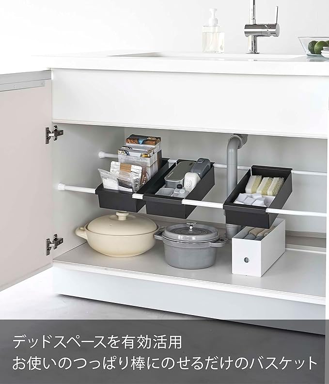 お使いのつっぱり棒にのせるだけのバスケット。キッチンや洗面のシンク下などをスッキリ整頓できます。散らかりがちな細かいお弁当グッズやレトルト食品、スポンジのストックなど、細々したものを収納するのに最適なバスケットタイプ。伸縮つっぱり棒用棚板L(別売)と組み合わせて洗濯機上などの空いている空間にも活用できます。つっぱり棒の上にのせるだけの簡単設置。キッチンではお弁当グッズなど細々したものの収納に。洗面室ではチューブ類のストックや洗濯ばさみの収納に。