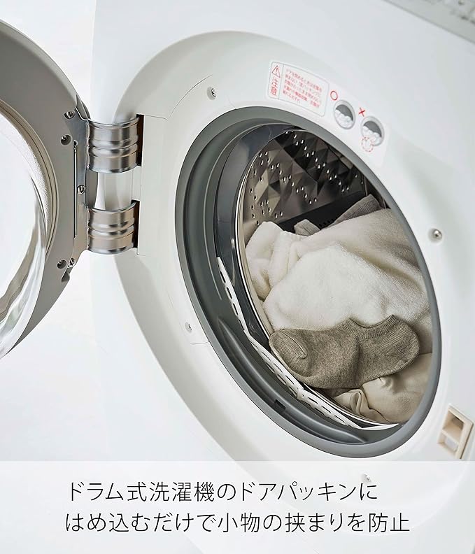 ドラム式洗濯機の小物挟まりを防止する、シリコーン製カバー 靴下やハンカチなどの小物が、ドラム式洗濯機ドアパッキンの隙間に挟まるのを防いでくれるシリコーン製のカバーです。ドラム式乾燥機で起りがちな、洗い・脱水・乾燥しきれなかった洗濯物のやり直しといった小さなイライラを解消できるアイテムです。はめ込んで押し込むだけで簡単に設置できます。なじみやすいシンプルデザイン カラーは清潔感を感じるホワイトで、インテリアやドラム式洗濯機にさりげなくなじむシンプルなデザインになっています。本体のサイズは幅44.5cm、奥行2.5cm、高さ4.7cmで、重さは70gの軽量です。ドアパッキンは溝の入り口が奥行き1.8cm以内で、溝に折り返しのあるものに対応しています。熱に強いから乾燥中でもそのまま使える 熱に強いシリコーン素材を採用しています。耐冷熱温度は-40~250℃なので、乾燥中でも溝にはめ込んだままそのまま使えるのが便利です。2ステップの簡単設置 シンプルな作りで設置はたったの2ステップです。短い側を手前にしドアパッキンの溝にはめ込み、手で奥までしっかり押し込むだけでセットが完了します。あとは通常通り洗濯機をまわすだけなので、面倒なことをしなくていいのが嬉しいポイント。丸洗いと吊るして干す簡単手入れ 細かいホコリや糸くずなどが気になったら、水で洗うだけで簡単に取れます。洗った後はお手持ちのフックに吊るして干すことで、いつでも清潔に保てます。