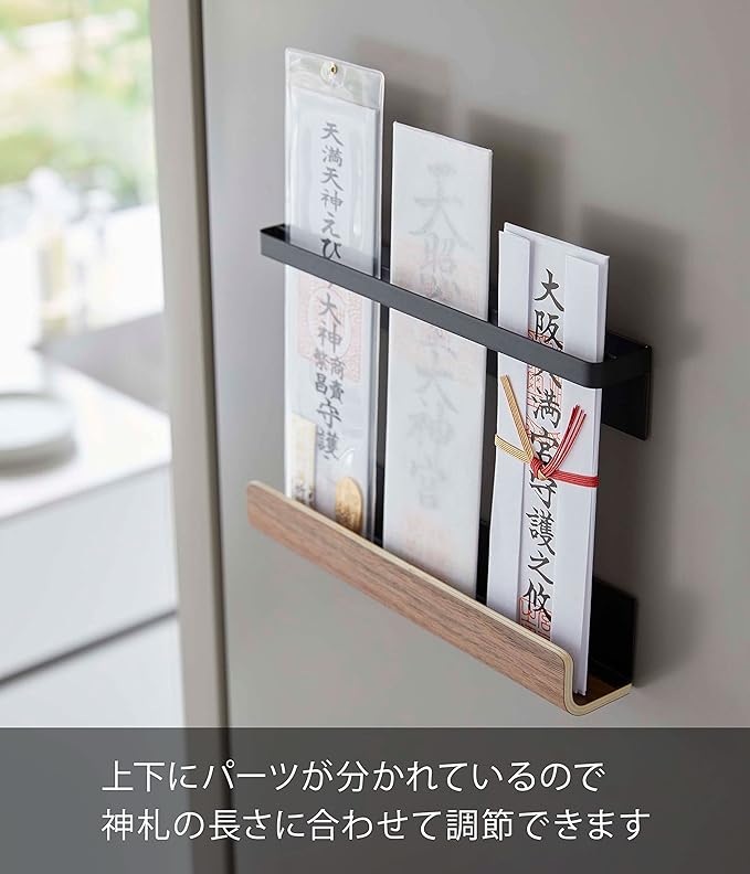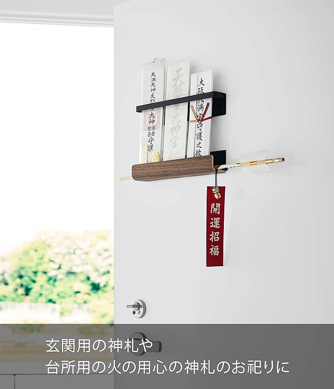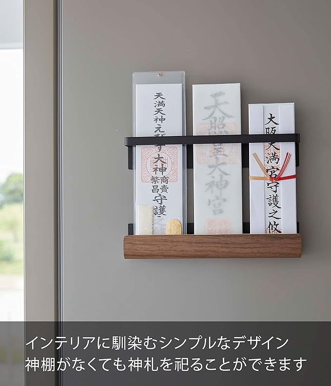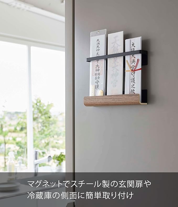 神棚がないご家庭に。マグネット神札ホルダー 神棚がないお家やマンションに住んでいる方にもおすすめな、マグネットタイプの神札ホルダーです。スチール製のドアや冷蔵庫などにピタッと付けられるので、壁に穴を開けたくない方も安心してお使いいただけます。お好みに合わせて選べる、2つのカラーバリエーション カラーは、シックな木目との組み合わせが上品なブラウンと、やわらかい印象のナチュラルをご用意しました。RINシリーズならではの木目との組み合わせは、和室でも洋室でも合わせやすく設置場所を選びません。神棚がない玄関や台所にも 玄関用の神札や、台所用の火の用心の神札を祀る際でも、マグネット神札ホルダーなら玄関ドアや冷蔵庫横などにつければ簡単に設置ができます。また、神札を壁から浮かせて祀ることができて、冷蔵庫や玄関扉の汚れが付きません。上下2つのパーツで高さ調節が可能 こちらの神札ホルダーは上下2つのパーツに分かれているので、お札のサイズに合わせて高さ調節ができます。こちらのワイドタイプは複数の神社でいただいた神札を一ヶ所でお祀りできたり、破魔矢も合わせて置けるのも◎。一体の神札を祀るシングルタイプも RINシリーズの『マグネット神札ホルダー』には一体の神札用のシングル対応もございます。それぞれの場所に合わせてサイズ違いを設置も可能です。※こちらのページは『マグネット神札ホルダー』となりシングルタイプは別ページよりご覧ください。