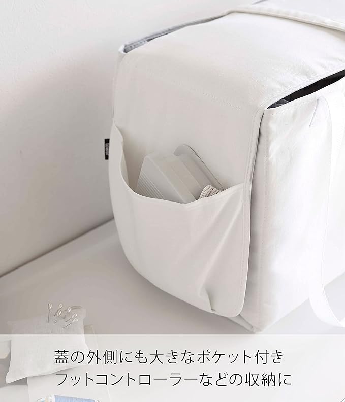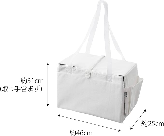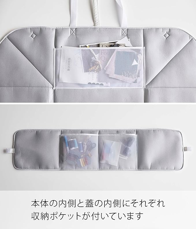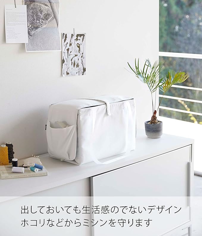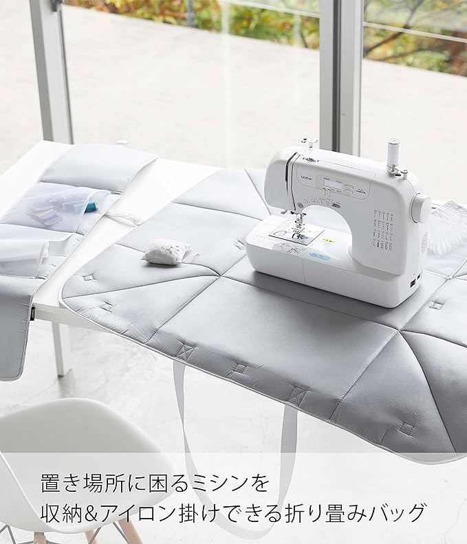1つ3役をこなすミシン用バッグ 置き場所に困るミシンをスッキリと収納する、持ち運びに便利なバッグです。バッグを広げてアイロンマットにしたり、小物を収納できるポケットが付いていたりと便利なアイテムです。一般的なレギュラーサイズのミシンが丁度良く収まるので、ホコリから守るのにも役立ちます。生活感を感じさせない2色のカラーバリエーション ミシン収納バッグのカラーバリエーションは、ホワイトとブラックの2色。どちらもツヤのない質感とシンプルなデザインなので落ち着いた雰囲気を与えるため、出しっぱなしにしても周りに溶け込みます。広げればアイロンマットへ早変わり ミシンを収納するバッグとして使うだけでなく、広げればアイロンマットに早変わりします。耐熱性に優れたアルミコーティング加工が施されているため高い熱効率を行うことで、素早くアイロン仕上げが可能です。作業スペースが広がるので、ハンカチや子供服といった小さなものから、シャツやパンツなど大きいものまでスムーズに・素早く・綺麗にシワを伸ばせます。開閉簡単で、持ち運びが楽な肩掛けバッグ型 バッグの広げ方は上部のフタと、本体側面に付いている面ファスナーを取り外すだけです。ミシンをしまうときは折り目に沿って畳み、フタを閉めるシンプルな構造です。作業場所から収納場所への移動には、長い持ち手を肩から掛けることで、重いミシンでも楽に持ち運べます。小物を収納できる3つのポケット付き 収納ポケットが3つ付いています。散らかりがち裁縫道具、ミシンに付属しているフットコントローラー、説明書、布などを収納するのに便利です。裁縫に必要なグッズがひとまとめにできるから、作業効率のアップにつながります。