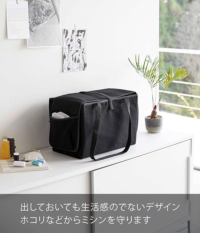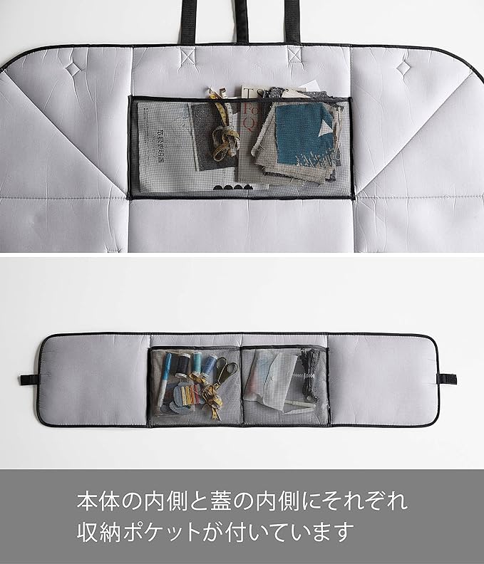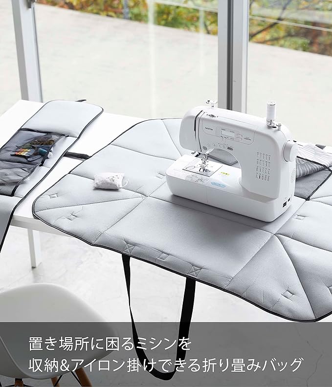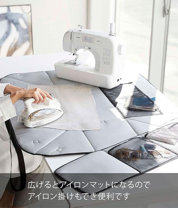 置き場所に困るミシンを収納できる。持ち運びにも便利なミシン収納バッグ。広げて、そのままミシン掛けができます。広い作業スペースとしても。散らかりがちな小物類を収納できる便利なポケット付き。