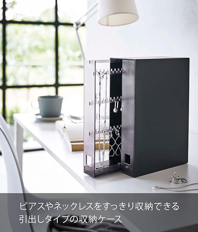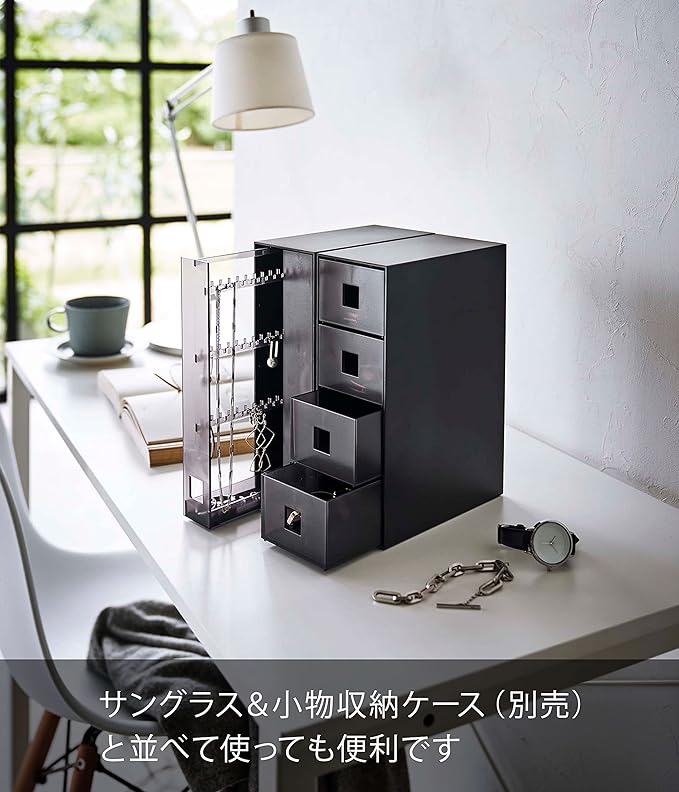 アクセサリーや小物類をスッキリ収納できる引き出しタイプの収納ケースシリーズ。ネックレスやピアスを大容量収納できるタイプ。サングラス&小物収納ケース(別売)と並べて使えばアクセサリー小物をまとめてスッキリと収納できます。最上段は収納部を下段より外側に配置しているので、長さのあるネックレスの収納にピッタリ。