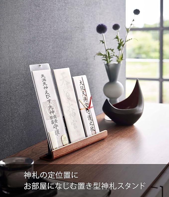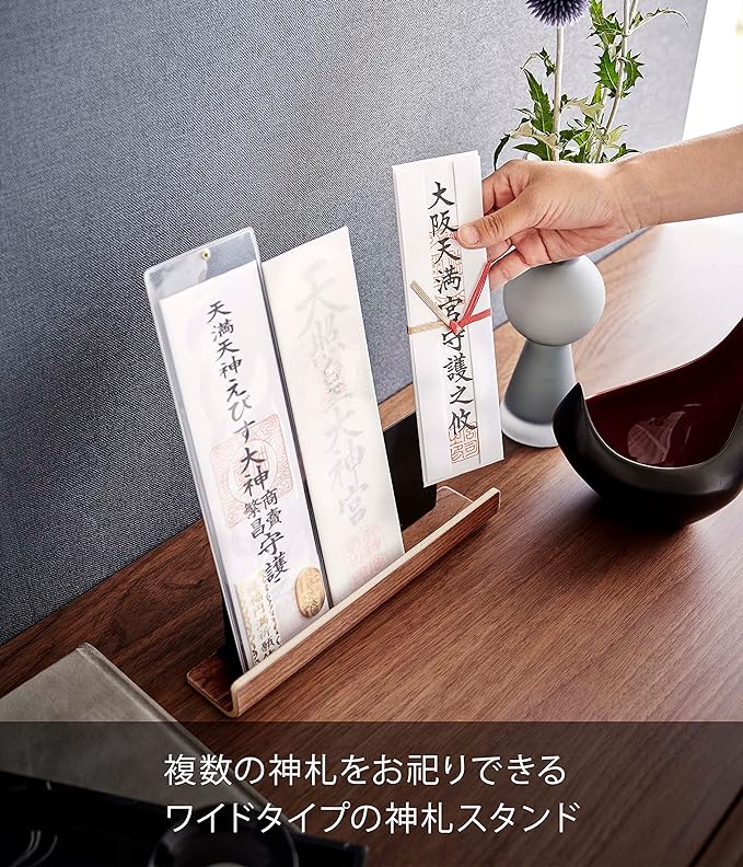 大切な神札を専用スタンドでお祀り 神社でいただいた神札を祀るのにぴったりな神札スタンドです。神棚がないご家庭では神札の置き場所に困りがちですが、神札スタンドをご使用いただければそんなお悩みも解決。いま祀っている神札は一年の感謝を込めて年の終わりにお焚き上げし、新年を迎えるタイミングで新たな神札をお祀りしましょう。お好みに合わせて選べる、2つのカラーバリエーション カラーは、シックな木目との組み合わせが上品なブラウンと、やわらかい印象のナチュラルをご用意しました。RINシリーズならではの木目との組み合わせは、和室でも洋室でも合わせやすく設置場所を選びません。木目のカラーは設置場所の家具と色を合わせて選択するのもおすすめです。複数の神札を同じ場所でお祀り 神札を立て掛けておけて神札の転倒を防ぎます。幅は25cmあり、一般的な神札なら3枚を並べて一度にお祀りが可能です。複数の神社でいただいた神札を一ヶ所でお祀りできるので便利。 壁への穴あけ不要で賃貸でもOK。 リビングのチェストの上など家族が集う場所に置くだけですぐに使えるスタンドです。壁への取り付けなどが不要なので、賃貸で壁に穴を開けられないお住まいにもぴったり。一体の神札を祀るシングルタイプも RINシリーズの『神札スタンド』には一体の神札用のシングル対応もございます。それぞれの場所に合わせてサイズ違いを設置も可能です。※こちらのページは『神札スタンド』となりシングルタイプは別ページよりご覧ください。
