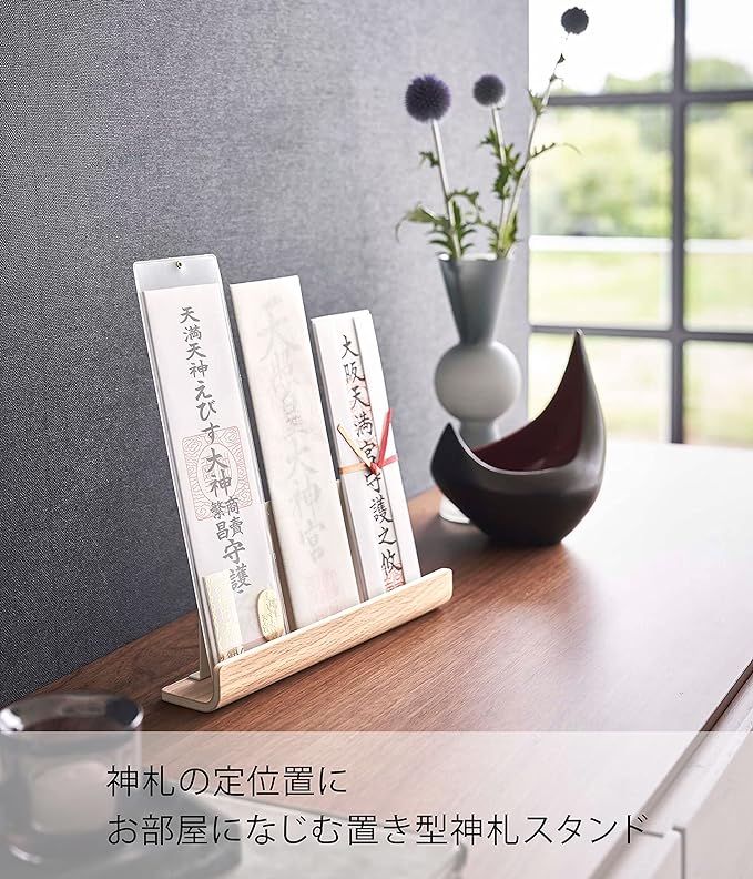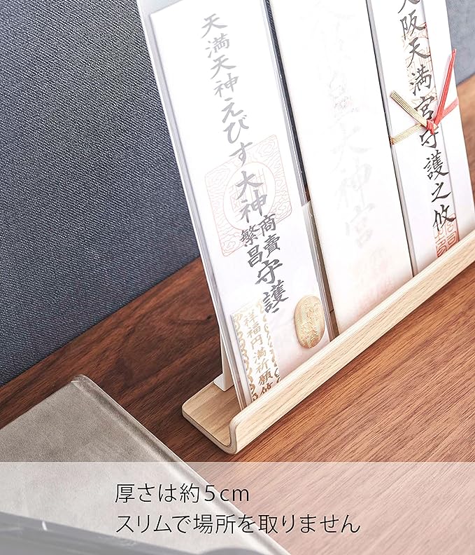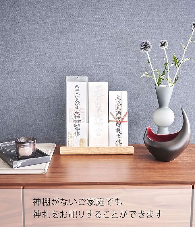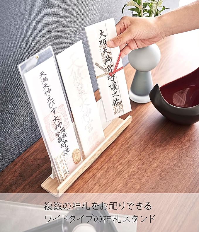 神札の定位置に。シンプルなので部屋になじむ置き型神札スタンド。神棚がないご家庭で置き場に困っていた神札を祀ることができる置き型のスタンドです。複数の神札を祀ることができるワイドタイプ。
