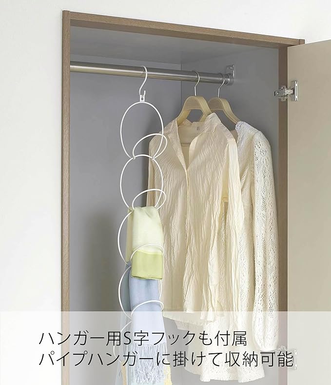 寝室や子供部屋などのクローゼットの折れ戸にも使用できる便利なハンガー。付属のS字フックを使えば帽子やスカーフ類をそのままクローゼットの中に収納できます。付属の木ねじを使ってそのまま壁につけられます。スカーフやマフラー等も引っ掛けるだけで収納OK。