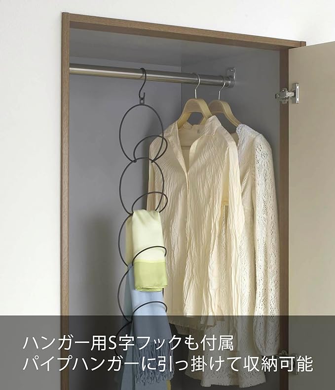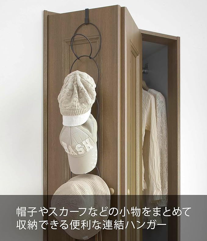 寝室や子供部屋などのクローゼットの折れ戸にも使用できる便利なハンガー。付属のS字フックを使えば帽子やスカーフ類をそのままクローゼットの中に収納できます。付属の木ねじを使ってそのまま壁につけられます。スカーフやマフラー等も引っ掛けるだけで収納OK。