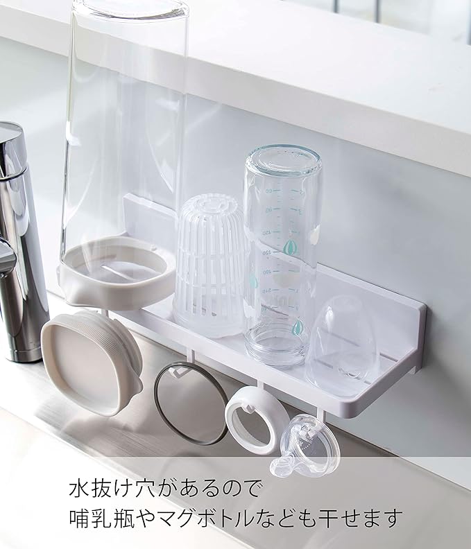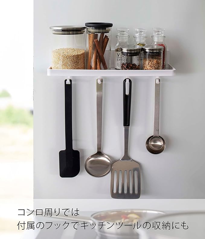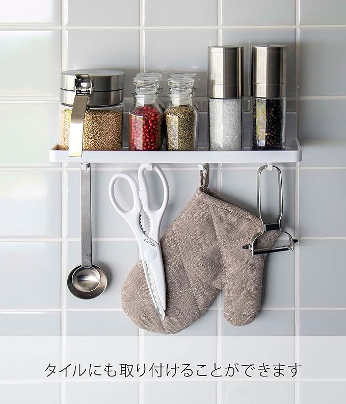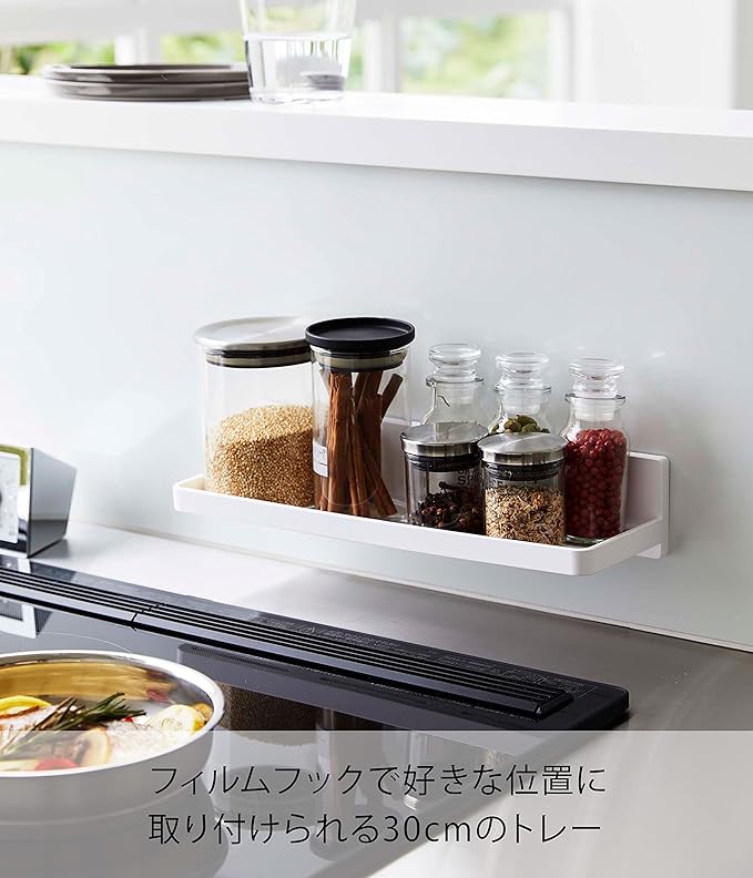 フィルムフックでお好みの位置に簡単取り付けの幅30cmトレー。浮かせるので衛生的。付属のフックを底面に取り付けて、掃除道具などの小物を掛けて収納できます。タイルやガラスドアにも取り付け可能。キッチンツールや調味料ボトルなどの収納に。水抜け穴があるので、哺乳瓶やグラスやマグボトルなども干せます。