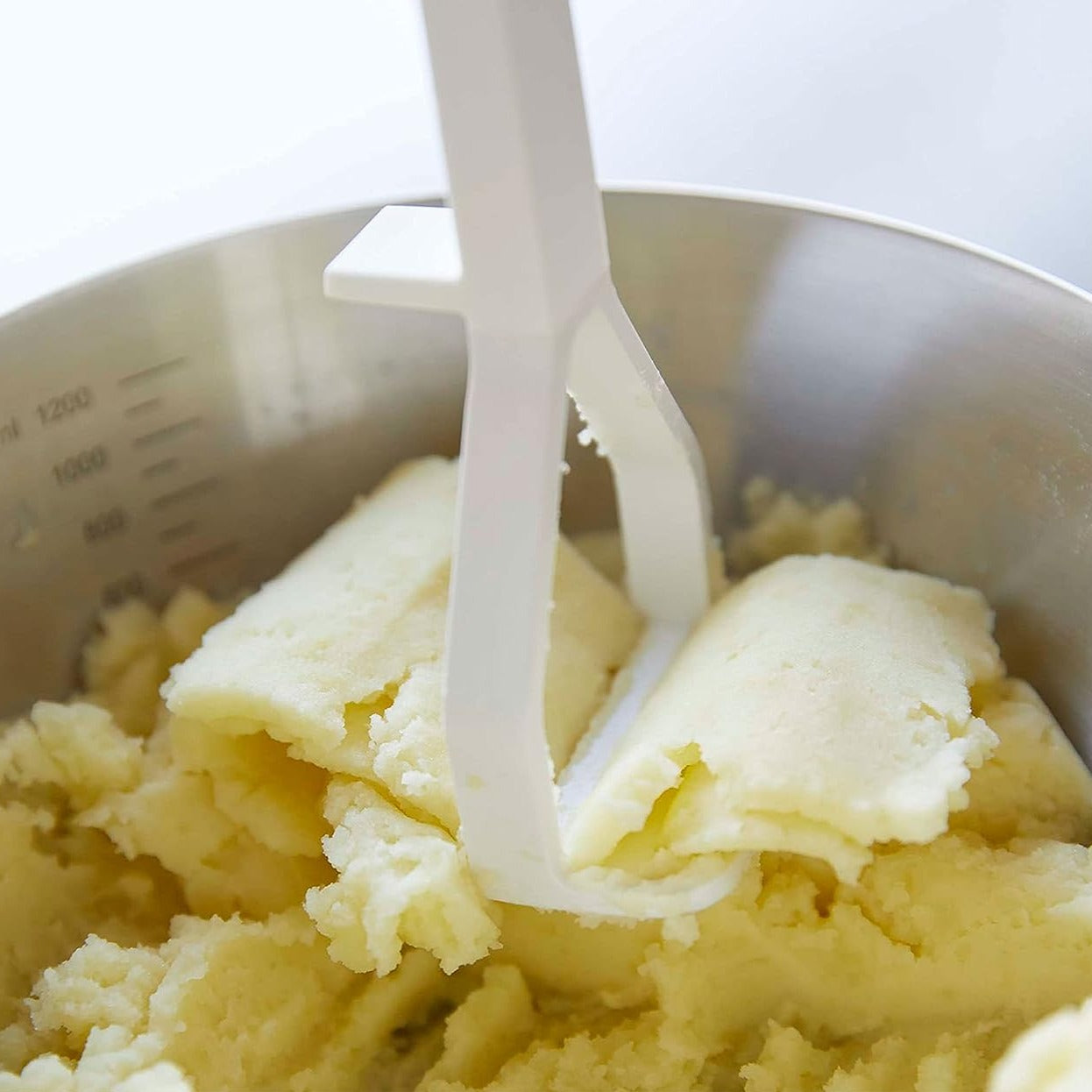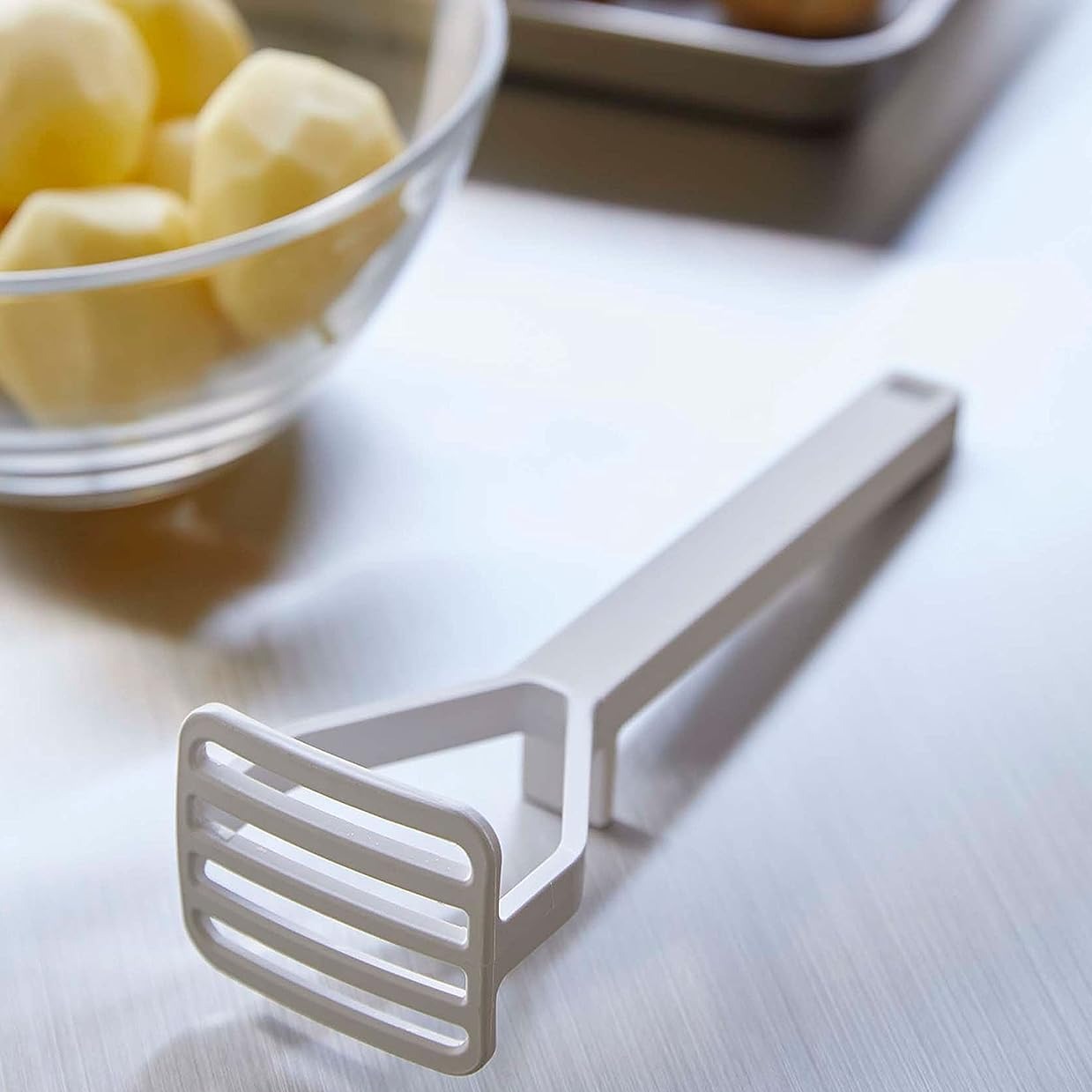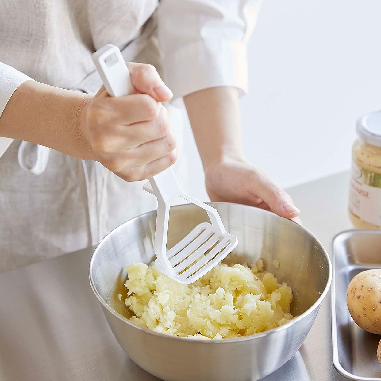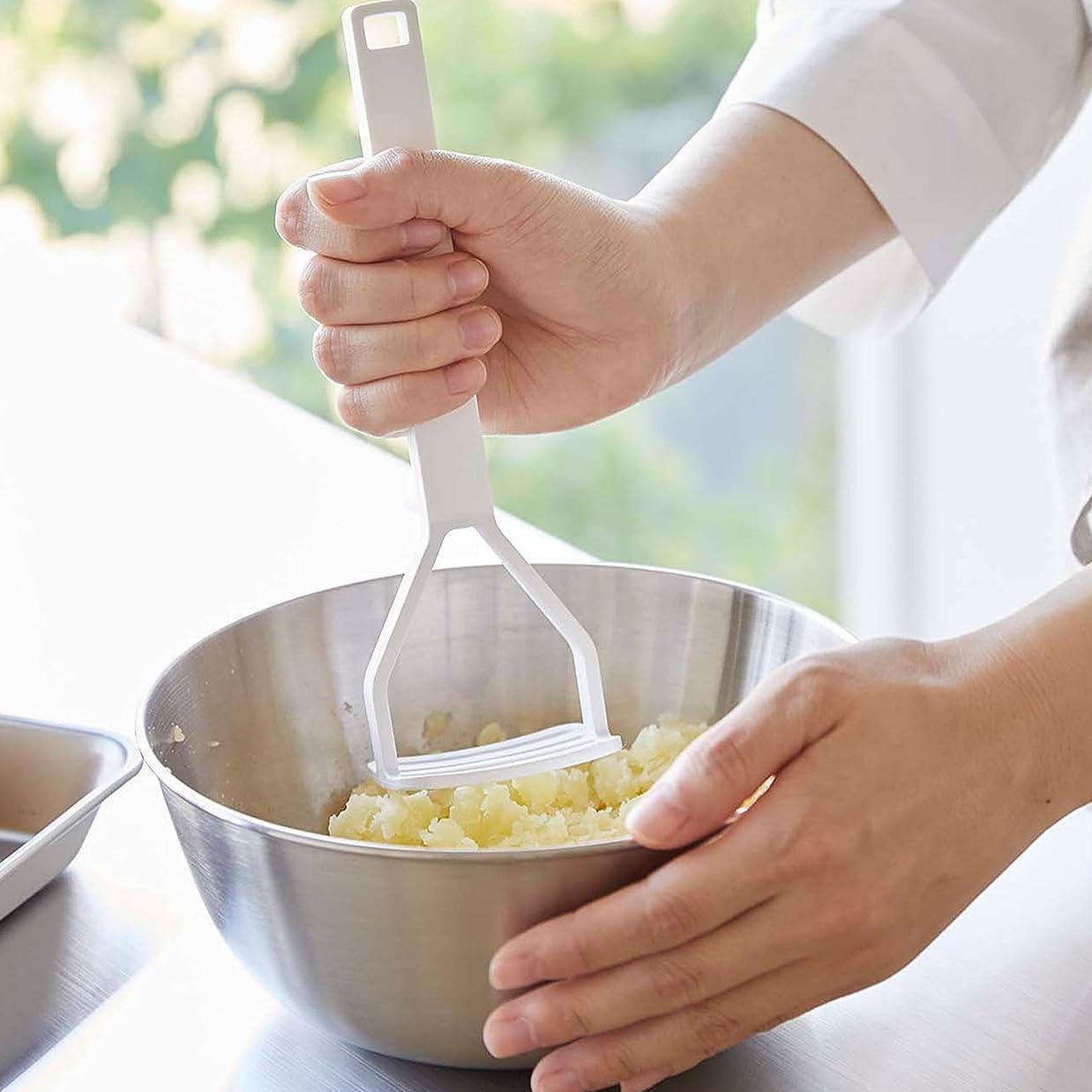 ちょい置きに便利なコンパクトマッシャー シリコーンハンドルで持ちやすいポテトマッシャーです。小ぶりなサイズ感だから、少量の芋をマッシュしたり、コンパクトなマッシャーが欲しいという方におすすめのアイテムです。先端が浮く設計なので、調理中のちょい置きにも便利です。好みで選べる2つのカラーバリエーション ポテトマッシャーのカラーバリエーションは、ホワイトとブラックの2つをご用意いたしました。キッチンの雰囲気やキッチングッズの色と合わせて、お好みの色をお選びいただけます。小ぶりだけどしっかり潰せるY字型 ヘッドの直径は5cm×6cmの小ぶりタイプで、少量の芋をマッシュするのに最適です。潰した芋が外に分散するので上部に溜まらず、スムーズな作業ができるのも魅力です。Y字型は両サイドから2点で支えるため、力を込めてしっかりと潰せるのも嬉しいポイント。ボウルや鍋を傷つけにくいナイロン素材 ハンドルはシリコーン素材で滑りやすく、マッシャー部分はナイロン素材でボウルや鍋の表面を傷つけにくさがあります。プラスチックボウルやテフロン・フッ素加工の鍋を使用している方におすすめです。潰しやすいゆるやかカーブ形状 マッシャー部分はボウルにフィットしやすいよう、ゆるくカーブがかっています。ボウルにしっかり押しつけられるから、強い力を込めなくてもなめらかに潰すことができます。