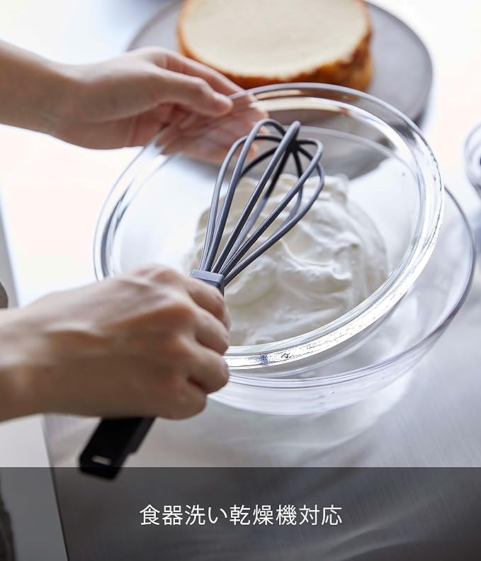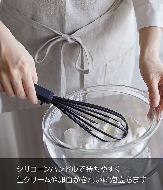 ガラスボウル等の表面をキズつけにくいナイロン製の泡立て器。シリコーンハンドルで持ちやすく生クリームや卵白がきれいに泡立ちます。先端が浮くので直置きにならずに清潔。ガラスボウル等の表面をキズつけにくいナイロン製。材料を混ぜるのにも便利。食器洗い乾燥機でも洗えます。