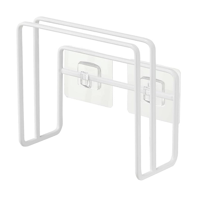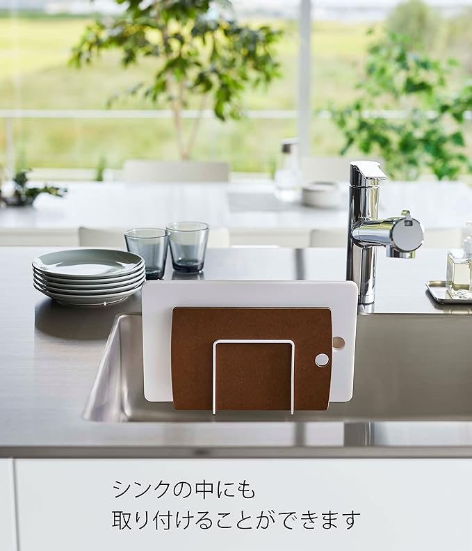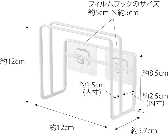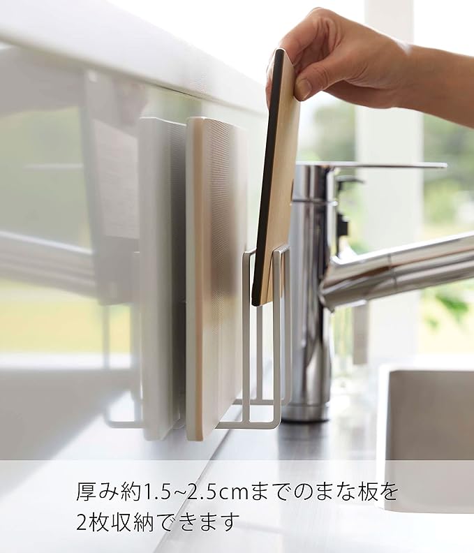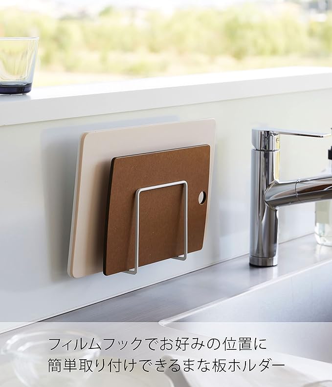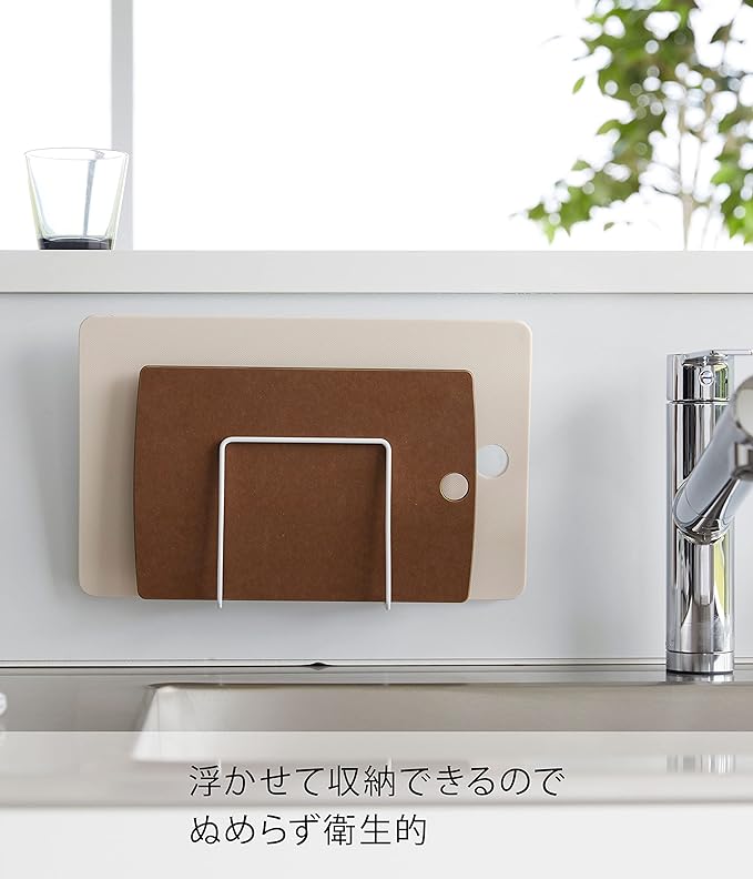 浮かせることで衛生的に収納できるまな板ホルダー フィルムフックで使いやすい位置に簡単に貼り付けるまな板ホルダーです。限られた空間を有効活用できるので、広さはそのままでスッキリ収納できます。複数のまな板を浮かせて収納することで、衛生的に乾かしたい・片づけたい方におすすめのアイテムです。インテリアに合わせやすい2つのカラー展開 まな板ホルダーのカラーバリエーションは、定番のホワイト、空間が引き締まるブラックの2色をご用意いたしました。家電やキッチングッズと色を統一するのもよし、アソートカラー(サブカラー)としてベースカラーとは異なる色を選択するなど、好みのカラーからお選びください。2枚のまな板が収納できる仕切り 厚み1.5cmと2.5cmまでのまな板を1枚ずつ収納できます。お肉・お魚・野菜用のように、サイズや用途が異なるまな板もくっつかず分けて収納できます。浮かせる収納だから早く乾いて衛生的 浮かせる収納なので風が通って乾きやすく、カビが生えるのを防いでくれます。水滴が落ちても拭きやすく、お掃除が簡単にできるのが嬉しいポイント。焼き網やトレーなどの薄い形状のアイテムの乾燥・収納にも最適です。さまざまなところに設置可能 光沢のある平らな油染みしない面(タイル・プラスチック面・ステンレス・ガラス・金属塗装面・人工大理石)に取り付け可能です。フィルムフックの設置範囲が広いので、空きスペースや使いやすい場所に設置できます。