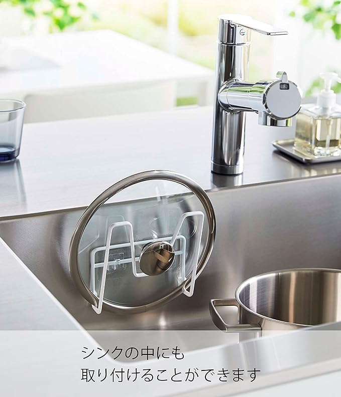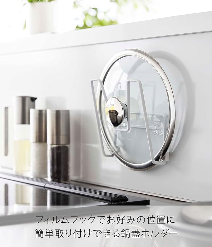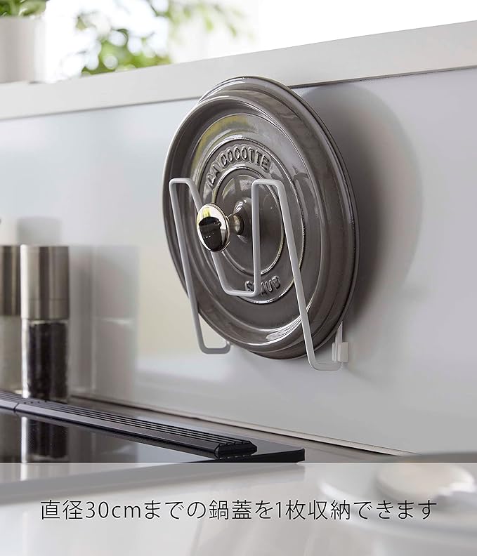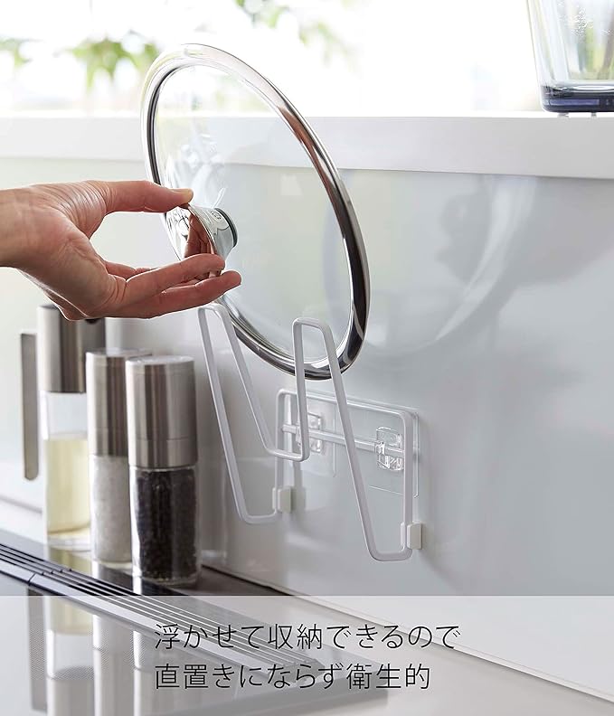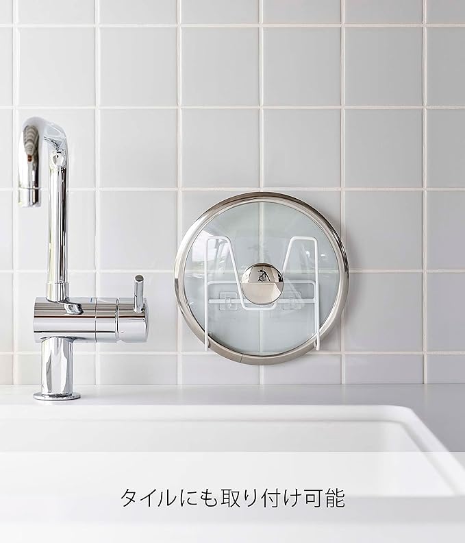 片手でサッと出し入れ可能な、浮かせる鍋蓋ホルダー フィルムフックで好みの位置に簡単設置ができる、浮かせる鍋蓋ホルダーです。わざわざ収納棚を開けて収納する必要がないので、料理中に片手でサッと出し入れでき、料理の効率アップにつながります。鍋蓋を置くスペースがない方、穴あけが不要だから賃貸にお住いの方にもおすすめのアイテムです。キッチングッズになじみやすい2つのカラー 鍋蓋ホルダーはホワイトとブラックの2色を展開しています。キッチンになじみやすいモノトーンカラーなので、他のキッチングッズやキッチン家電と色を統一することで、おしゃれな空間を演出可能です。アクセントカラーとして取り入れるのも◎。シンクにも取り付けできて空間を有効活用 直径14~30cmまでの鍋蓋を1枚収納できます。水やサビに強いスチール製を採用しているので、キッチンパネルはもちろん、シンクの中にも取り付け可能です。光沢のあるところに貼り付けるだけなので、工具不要なのも魅力。キッチンまわりのお手入れもラクラク 浮かせて収納するからコンパクトなキッチンでも気軽に設置できます。ホルダーまわりの水滴や油汚れなどが気になったらサッと拭くだけなのでお手入れしやすく、いつでも清潔に保てます。設置面を傷つけにくいクッション付き フィルムフックでピタッと簡単に取り付けた後は、サッと鍋蓋を立てかけるだけ。キッチンパネルやシンクなどの設置面と、ホルダーが触れるところに付属のクッションを付けるだけで、傷防止になります。ホルダーの安定感にも役立つので、気になる位置に好みでお取り付けください。